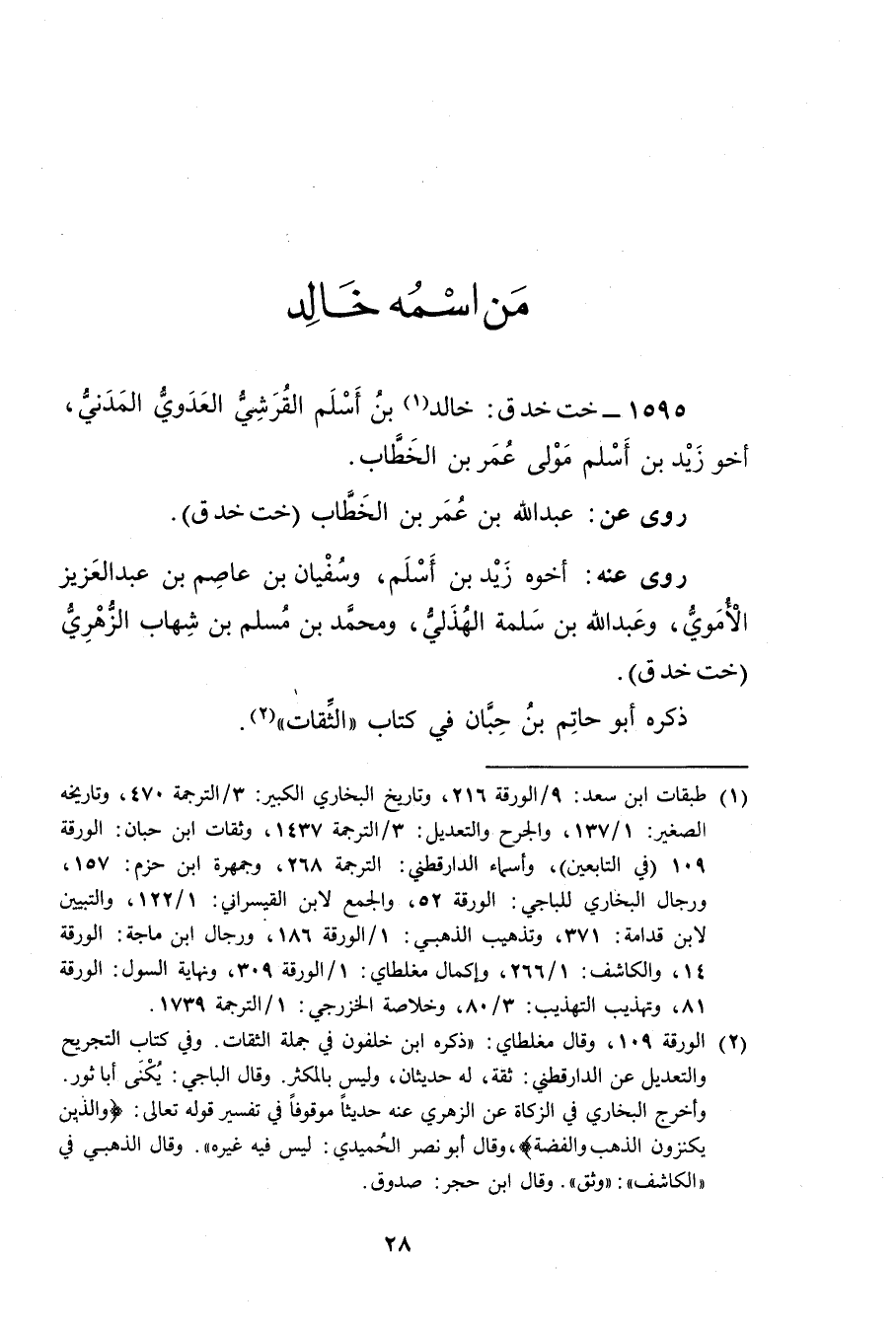 1595 - خت خد ق: خالد بن أسلم القرشي العدوي المدني (1) ، أخو زيد بْن أسلم مولى عُمَر بْن الخطاب.