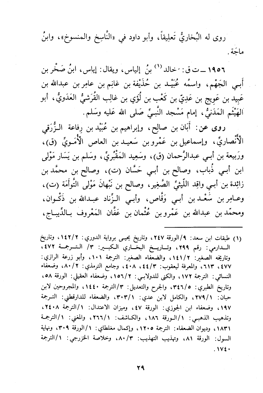 1956 - ت ق: خالد بن إلياس (1) ، ويُقال: إياس، ابن صخر بْن أَبي الجهم، واسمه عُبَيد بْن حذيفة بْن غانم بْن عامر بْن عَبد اللَّهِ بْن عُبَيد بْن عويج بْن عدي بْن كعب بْن لؤي بْن غالب القرشي العدوي، أَبُو الهيثم المدني، إمام مسجد النَّبِيّ صلى الله عليه وسلم.