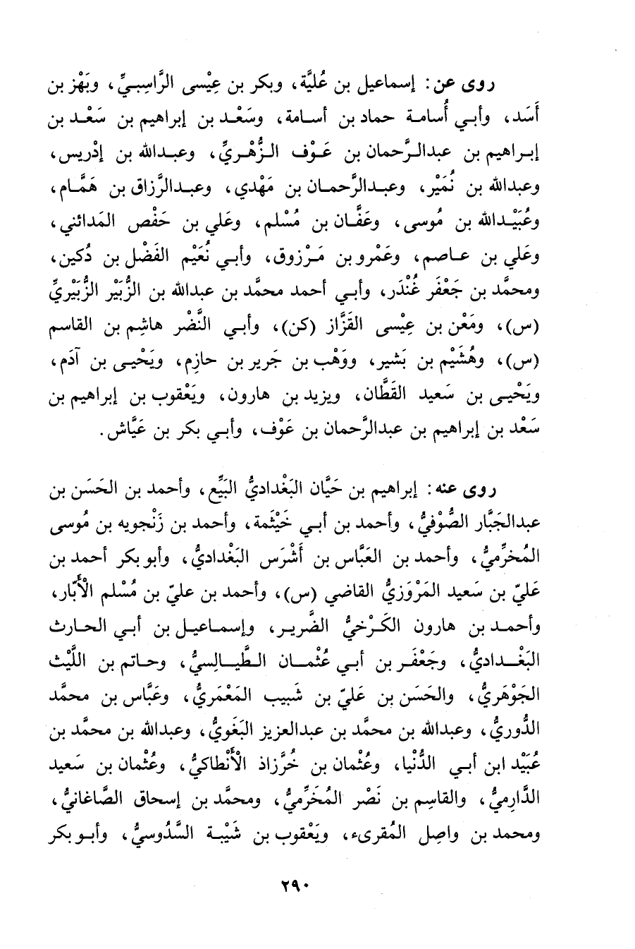 رَوَى عَن: إسماعيل بن علية، وبكر بْن عِيسَى الراسبي، وبهز بْن أسد، وأبي أسامة حماد بْن أسامة، وسعد بْن إِبْرَاهِيمَ بْن سعد بْن إِبْرَاهِيم بْن عَبْد الرَّحْمَنِ بْن عوف الزُّهْرِيّ، وعبد الله بْن إدريس، وعبد الله بْن نمير، وعبد الرحمن بْن مهدي، وعبد الرزاق بْن هما م، وعُبَيد الله بْن مُوسَى، وعفان بْن مسلم، وعلي بْن حفص المدائني، وعلي بْن عاصم، وعَمْرو بْن مرزوق، وأبي نعيم الفضل بْن دكين، ومحمد بْن جَعْفَر غندر، وأبي أَحْمَد مُحَمَّد بْن عَبد اللَّهِ بْن الزبير الزبيري، (س) ومعين بْن عِيسَى القزاز (كن) ، وأبي النضر هاشم بْن الْقَاسِم (س) ، وهشيم بْن بشير، ووهب بْن جرير بْن حازم، ويحيى بْن آدم، ويحيى بن سَعِيد القطان، ويزيد بْن هارون، ويعقوب بْن إِبْرَاهِيم بْن سعد بْن إِبْرَاهِيم بْن عَبْد الرَّحْمَنِ بْن عوف، وأبي بَكْر بْن عياش.