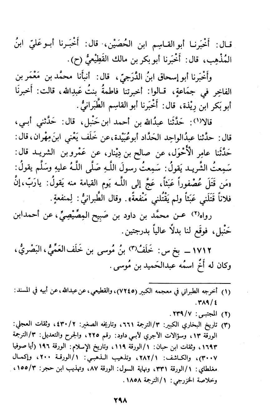 قالا (1) : حَدَّثَنَا عَبد اللَّهِ بْن أَحْمَد بْن حنبل، قال: حَدَّثني أبي، قال: حَدَّثَنَا عَبْد الْوَاحِدِ الْحَدَّادُ أَبُو عُبَيدة، عَنْ خَلَفٍ يَعْنِي ابْنَ مَهْرَانَ، قال: حَدَّثَنَا عَامِرٌ الأَحْوَلُ، عَنْ صَالِحِ بْنِ دِينَارٍ، عَنْ عَمْرو بْنِ الشَّرِيدِ قال: سَمِعْتُ الشَّرِيدَ يَقُولُ: سمعت رَسُول اللَّهِ صَلَّى اللَّهُ عَلَيْهِ وسَلَّمَ يَقُولُ: مَنْ قَتَلَ عَصْفُورًا عَبَثًا، عَجَّ إِلَى اللَّهِ يوم القامة مِنْهُ يَقُولُ: يَا رَبُّ، إِنَّ فُلانًا قَتَلَنِي عَبَثًا ولَمْ يَقْتُلْنِي مَنْفَعَةً"وَقَال الطبراني: لمنفعة.