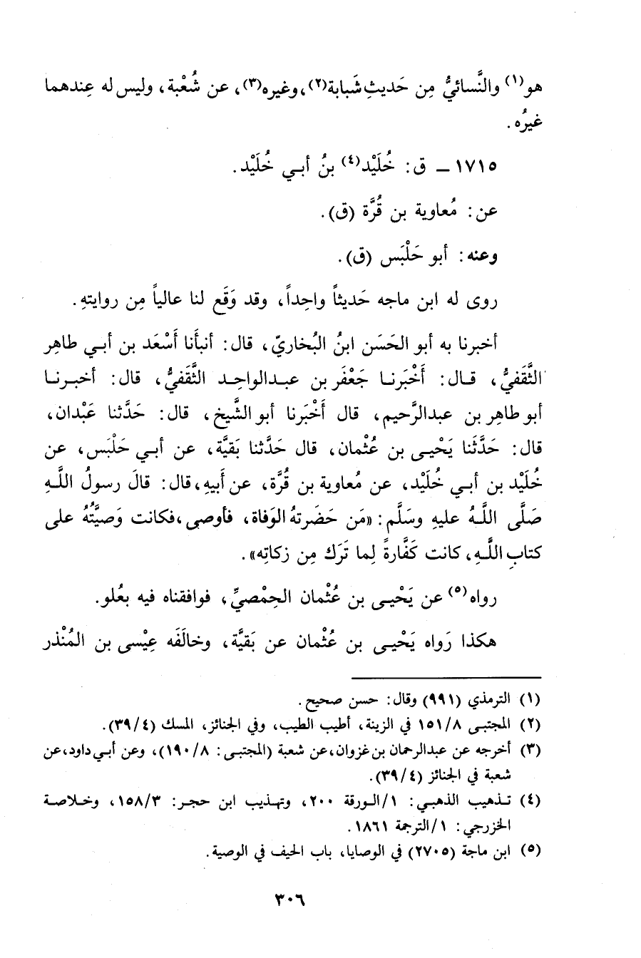أَخْبَرَنَا بِهِ أبو الحسن بْن البخاري، قال: أَنْبَأَنَا أَسْعَدُ بْنُ أَبي طَاهِرٍ الثَّقَفِيُّ، قال: أَخْبَرَنَا جَعْفَرُ بْنُ عَبْدِ الْوَاحِدِ، الثَّقَفِيُّ، قال: أَخْبَرَنَا أَبُو طَاهِرِ بْنُ عَبد الرَّحِيمِ، قال أَخْبَرَنَا أَبُو الشَّيْخِ، قال: حَدَّثَنَا عَبْدَانُ، قال: حَدَّثَنَا يَحْيَى بْنُ عُثْمَانَ، قال حَدَّثَنَا بَقِيَّةُ، عَن أَبِي حَلْبَسٍ، عَنْ خُلَيْدِ بْنِ أَبي خُلَيْدٍ، عَنْ مُعَاوِيَةَ بْنُ قُرَّةَ، عَن أَبِيهِ، قال: قال رَسُولُ اللَّهِ صلى الله عَلَيْهِ وسَلَّمَ: مَنْ حَضَرَتْهُ الْوَفَاةُ، فَأَوْصَى، فَكَانَتْ وصِيَّتُهُ عَلَى كِتَابِ اللَّهِ، كَانَتْ كَفَّارَةٌ لِمَا تَرَكَ مِنْ زَكَاتِهِ.