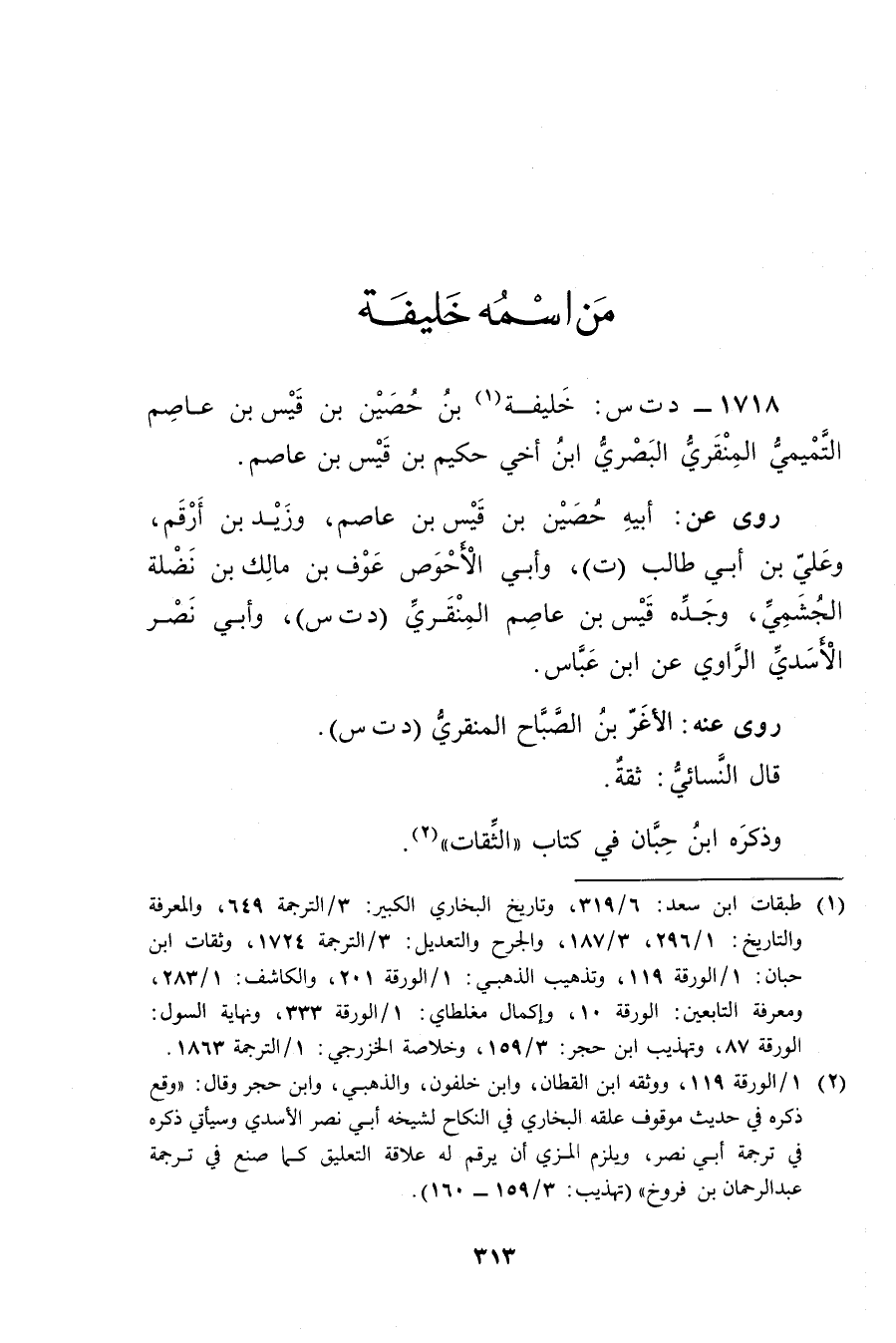 1718 - د ت س: خليفة بن حصين بن قيس بن عاصم التميمي المنقري البَصْرِيّ ابْن أخي حكيم بْن قيس بْن عاصم (1) .
