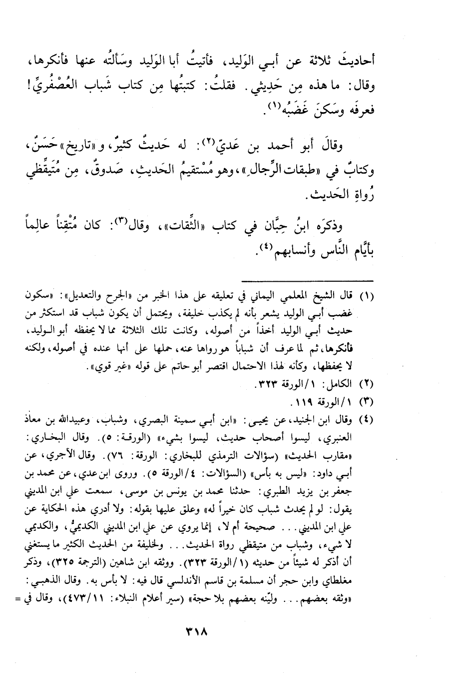 (1) قال الشخى المعلمي اليماني في تعليقه على هذا الخبر من"الجرح والتعديل": سكون غضب أبي الوليد يشعر بأنه لم يكذب خليفة، ويحتمل أن يكون شباب قد استكثر من حديث أبي الوليد أخذا من أصوله، وكانت تلك الثلاثة مما لا يحفظه أبو الوليد، فأنكرها، ثم لما عرف أن شبابا هو رواها عنه، حملها على أنها عنده في أصوله، ولكنه لا يحفظها، وكأنه لهذا الاحتمال اقتصر أبو حاتم على قوله"غير قوي.