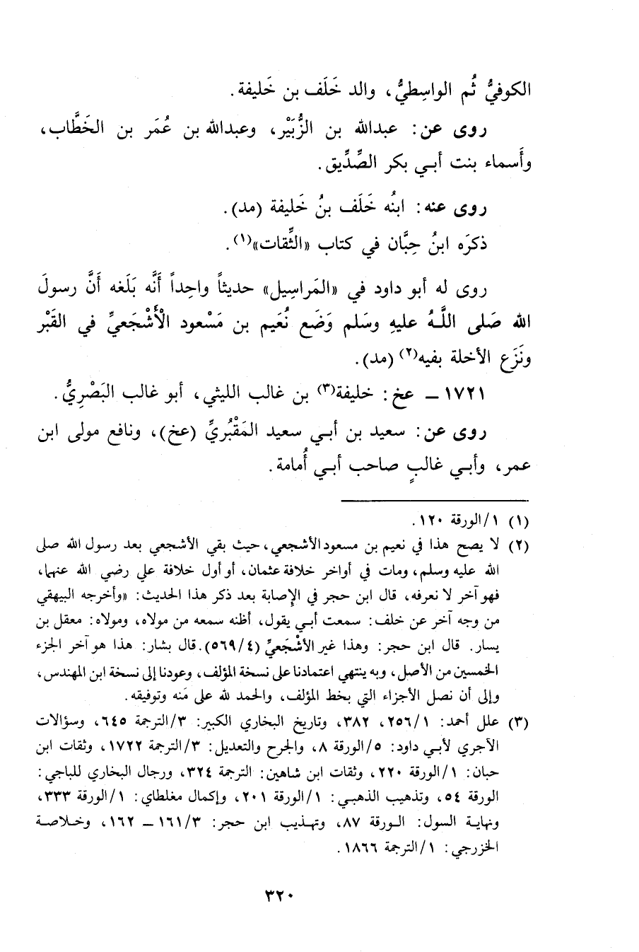 (3) علل أحمد: 1 / 256، 382، وتاريخ البخاري الكبير: 3 / الترجمة 645، وسؤالات الآجري لابي داود: 5 / الورقة 8، والجرح والتعديل: 3 / الترجمة 1722، وثقات ابن حبان: 1 / الورقة 220، وثقات ابن شاهين: الترجمة 324، ورجال البخاري للباجي: الورقة 54، وتذهيب الذهبي: 1 / الورقة 201، وإكمال مغلطاي: 1 / الورقة 333، ونهاية السول: الورقة 87، وتهذيب ابن حجر: 3 / 161 - 162، وخلاصة الخزرجي: 1 / الترجمة 1866.