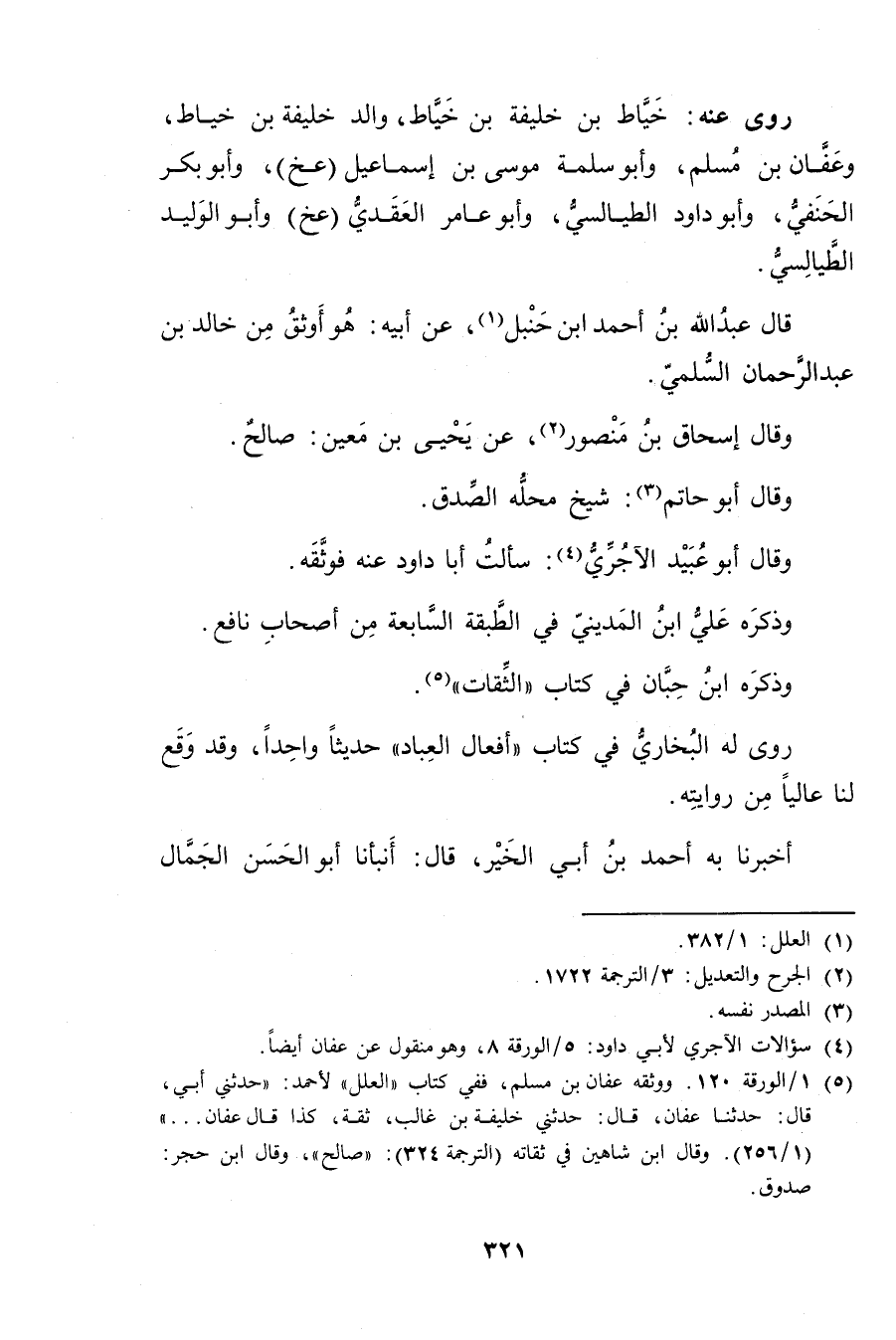 (5) 1 / الورقة 120، ووثقه عفان بن مسلم ففي كتاب"العلل"لأحمد: حَدَّثني أَبِي، قال: حَدَّثَنَا عَفَّانُ، قال: حدثني خليفة بن غالب، ثقة، كذا قال عفان ... ". (1 / 256) وَقَال ابن شاهين في ثقاته (الترجمة 324) : صالح"، وَقَال ابن حجر: صدوق.