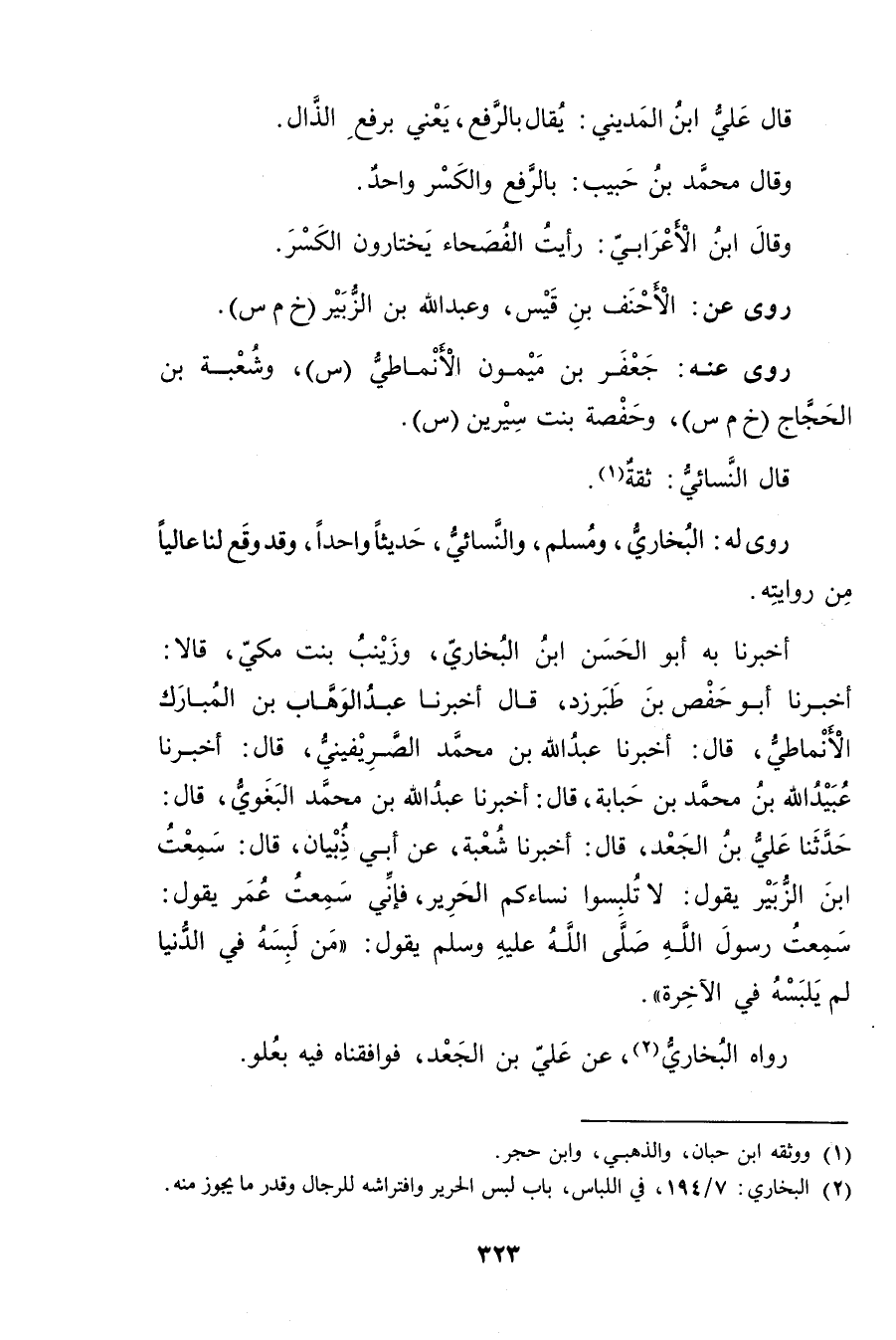 أخبرنا بِهِ أَبُو الْحَسَنِ بْنُ البخاري، وزينب بنت مكي، قَالا: أخبرنا أبو حفص بن طَبَرْزَذَ، قال أخبرنا عبد الوهاب بْن المبارك الأَنْمَاطِيّ، قال: أخبرنا عَبد الله بْن مُحَمَّد الصريفيني، قال: أَخْبَرَنَا عُبَيد اللَّهِ بْنُ مُحَمَّدِ بْنِ حُبَابَةَ، قال: أَخْبَرَنَا عَبد الله بْن مُحَمَّد البغوي، قال: حَدَّثَنَا علي بْن الجعد، قال: أخبرنا شعبة، عَن أبي ذبيان، قال: سمعت ابن الزير يَقُولُ: لا تُلْبِسُوا نِسَاءَكُمُ الْحَرِيرَ، فَإِنِّي سَمِعْتُ عُمَر يَقُولُ: سَمِعْتُ رَسُول اللَّهِ صلى الله عليه وسَلَّمَ يَقُولُ: مَنْ لَبِسَهُ فِي الدُّنْيَا لَمْ يَلْبَسْهُ فِي الآخِرَةِ.