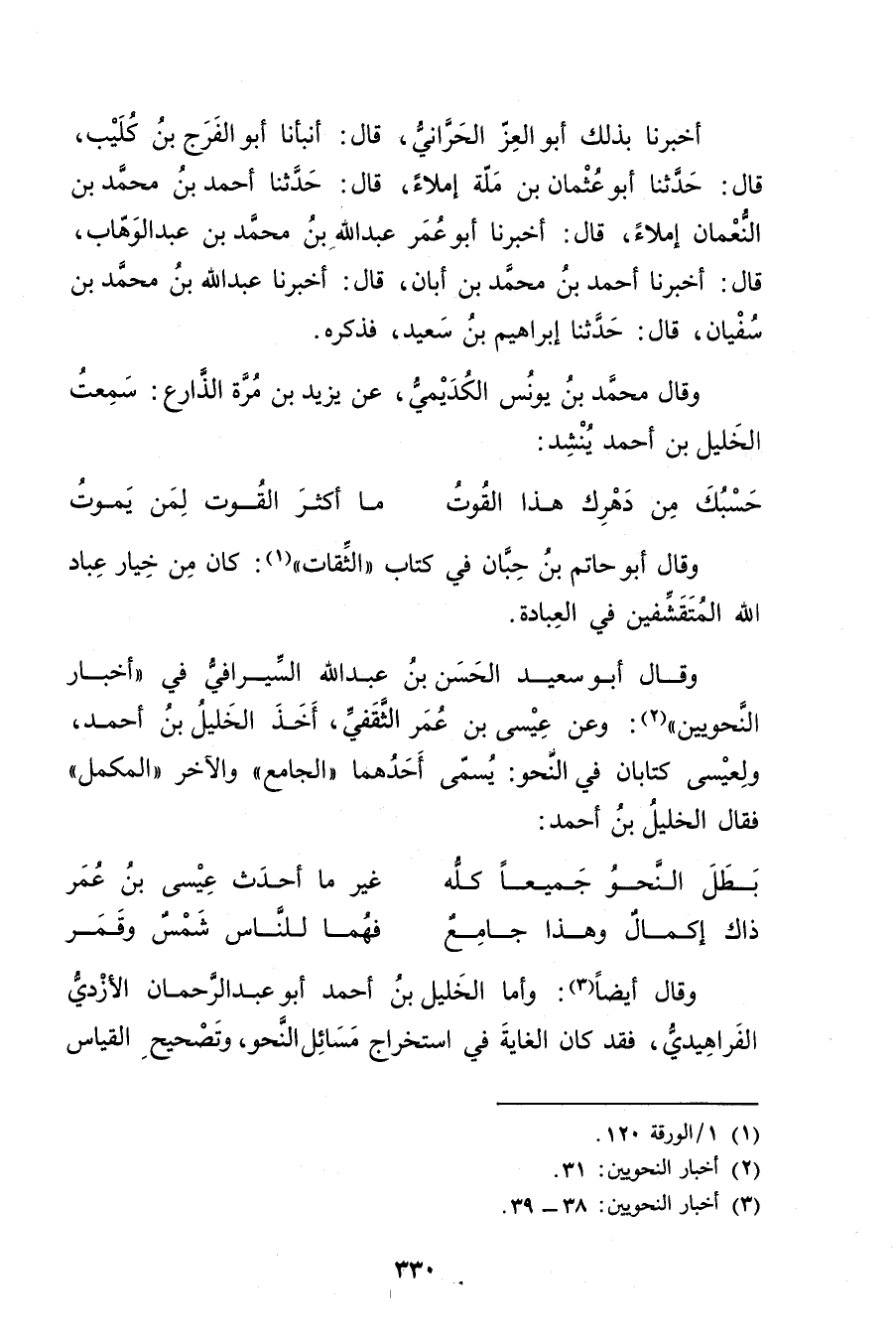 وَقَال أيضا (3) : وأما الخليل بْن أَحْمَدَ أَبُو عَبْد الرَّحْمَنِ الأزدي الفراهيدي، فقد كان الغاية فِي استخراج مسائل النحو، وتصحيح القياس
