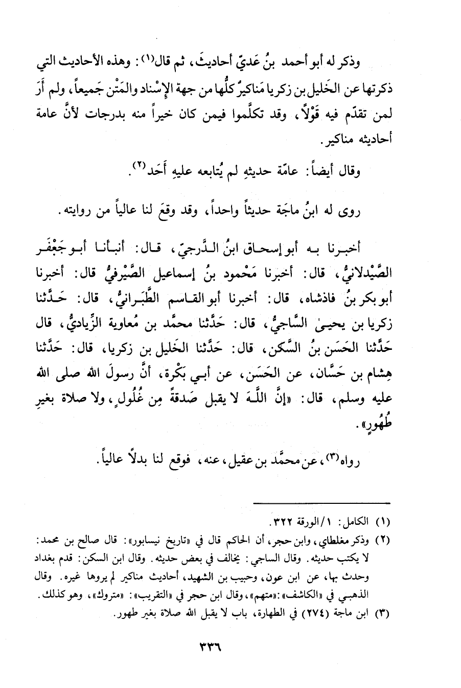 وذَكَرَ لَهُ أَبُو أَحْمَدَ بْنُ عدي أحاديث، ثم قال (1) : وهذه الأحاديث التي ذكرتها عَنِ الخليل بْن زَكَرِيَّا مناكير كلها من جهة الإسناد والمتن جميعا، ولم أر لمن تقدم فيه قولا، وقد تكلموا فيمن كان خيرا منه بدرجات لأن عامة أحاديثه مناكير.