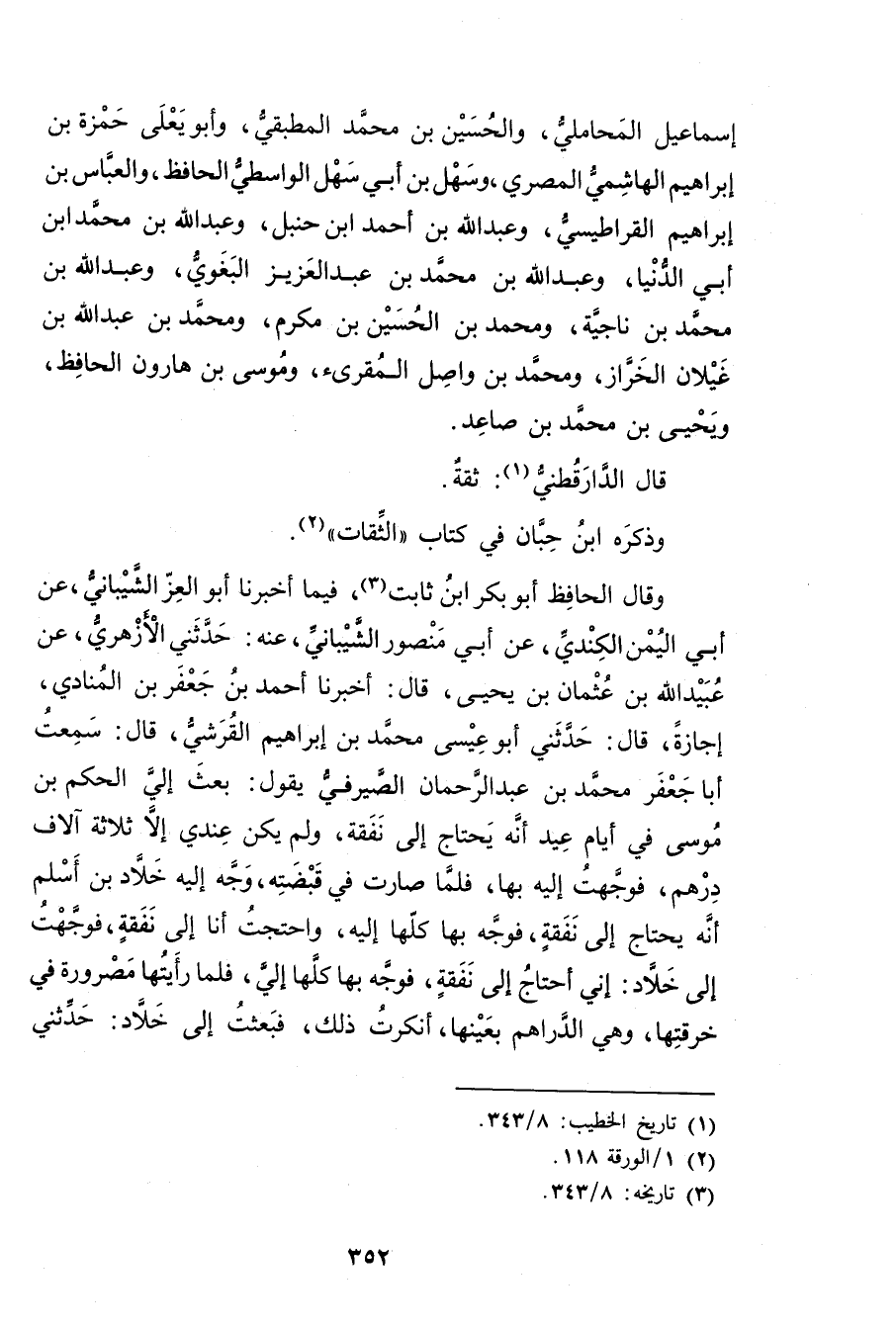 وَقَال الحافظ أَبُو بكر بْن ثابت (3) ، فيما أخبرنا أَبُو العز الشَّيْبَانِيُّ، عَن أَبِي الْيُمْنِ الْكُنْدِيِّ، عَن أبي منصور الشيباني، عَنه: حَدَّثَنِي الأزهري، عَنْ عُبَيد اللَّه بْن عُثْمَانَ بْن يَحْيَى، قال: أَخْبَرَنَا أَحْمَد بْن جعفر بْن المنادي، إجازة، قال: حَدَّثَنِي أَبُو عِيسَى مُحَمَّد بْن إِبْرَاهِيمَ القرشي، قال: سمعت أبا جَعْفَر مُحَمَّد بْن عَبْد الرَّحْمَنِ الصَّيْرَفِيّ يَقُولُ: بعث الي الحكم بْن موسى فِي أيام عيد أَنَّهُ يحتاج إِلَى نفقة، ولم يكن عندي إلا ثلاثة آلاف درهم.
