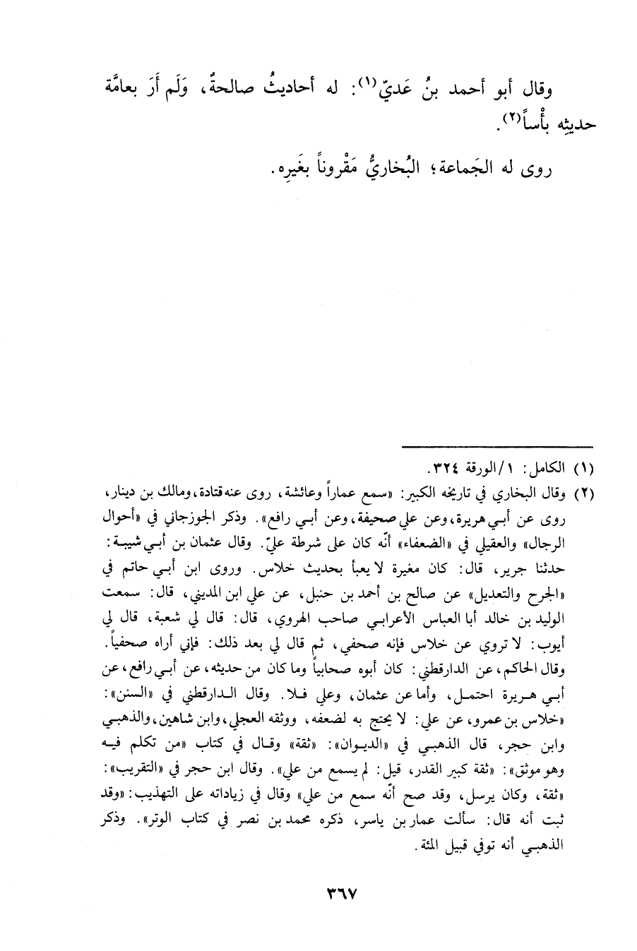 (2) وقَال البُخارِيُّ في تاريخه الكبير: سمع عمارا وعائشة، روى عنه قتادة، ومالك بن دينار، روى عَن أبي هُرَيْرة، وعن علي صحيفة، وعَن أبي رافع"وذكر الجوزجاني، في "أحوال الرجال"والعقيلي في "الضعفاء"أنه كان على شرطة علي. وَقَال عثمان بن أَبي شَيْبَة: حَدَّثَنَا جرير، قال: كان مغيرة لا يعبأ بحديث خلاس. وروى ابن أَبي حاتم في "الجرح والتعديل"عن صالح بن أحمد بن حنبل، عن علي ابن المديني، قال: سمعت الوليد بن خالد أبا العباس الاعرابي صاحب الهروي، قال: قال لي شعبة، قال لي أيوب: لا تروي عن خلاس فإنه صحفي، ثم قال لي بعد ذلك: فإني أراه صحفيا.