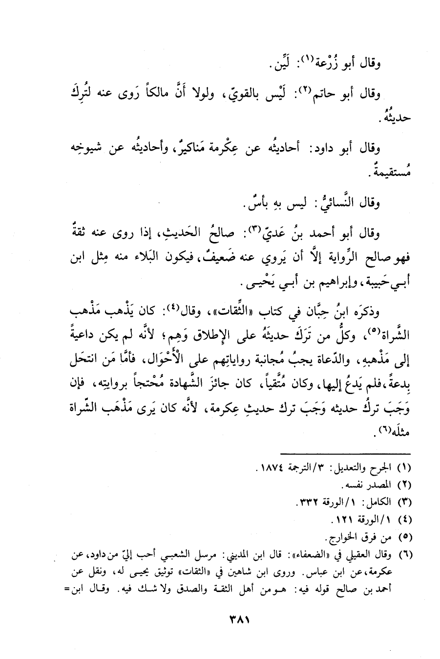 وذكره ابنُ حِبَّان فِي كتاب "الثقات" وَقَال (4) : كان يذهب مذهب الشراة (5) وكل من ترك حديثه عَلَى الإطلاق وهم، لأنه لم يكن داعية إلا مذهبه، والدعاة يجب مجانبة رواياتهم عَلَى الأحوال، فأما من انتحل بدعة، فلم يدعه إليها، وكان متقيا، كان جائز الشهادة محتجا بروايته، فإن وجب ترك حديثه وجب ترك حديث عكرمة، لأنه كان يرى مذهب الشراة مثله (6) .