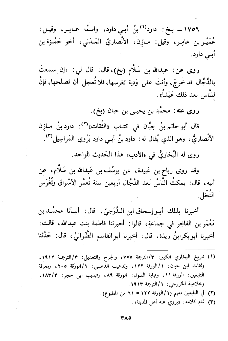 (1) تاريخ البخاري الكبير: 3 / الترجمة 775، والجرح والتعديل: 3 / الترجمة 1912، وثقات ابن حبان: 1 / الورقة 122، وتذهيب الذهبي: 1 / الورقة 205، ومعرفة التابعين: الورقة 11، ونهاية السول: الورقة 89، وتهذيب ابن حجر: 3 / 183، وخلاصة الخزرجي: 1 / الترجمة 1913.