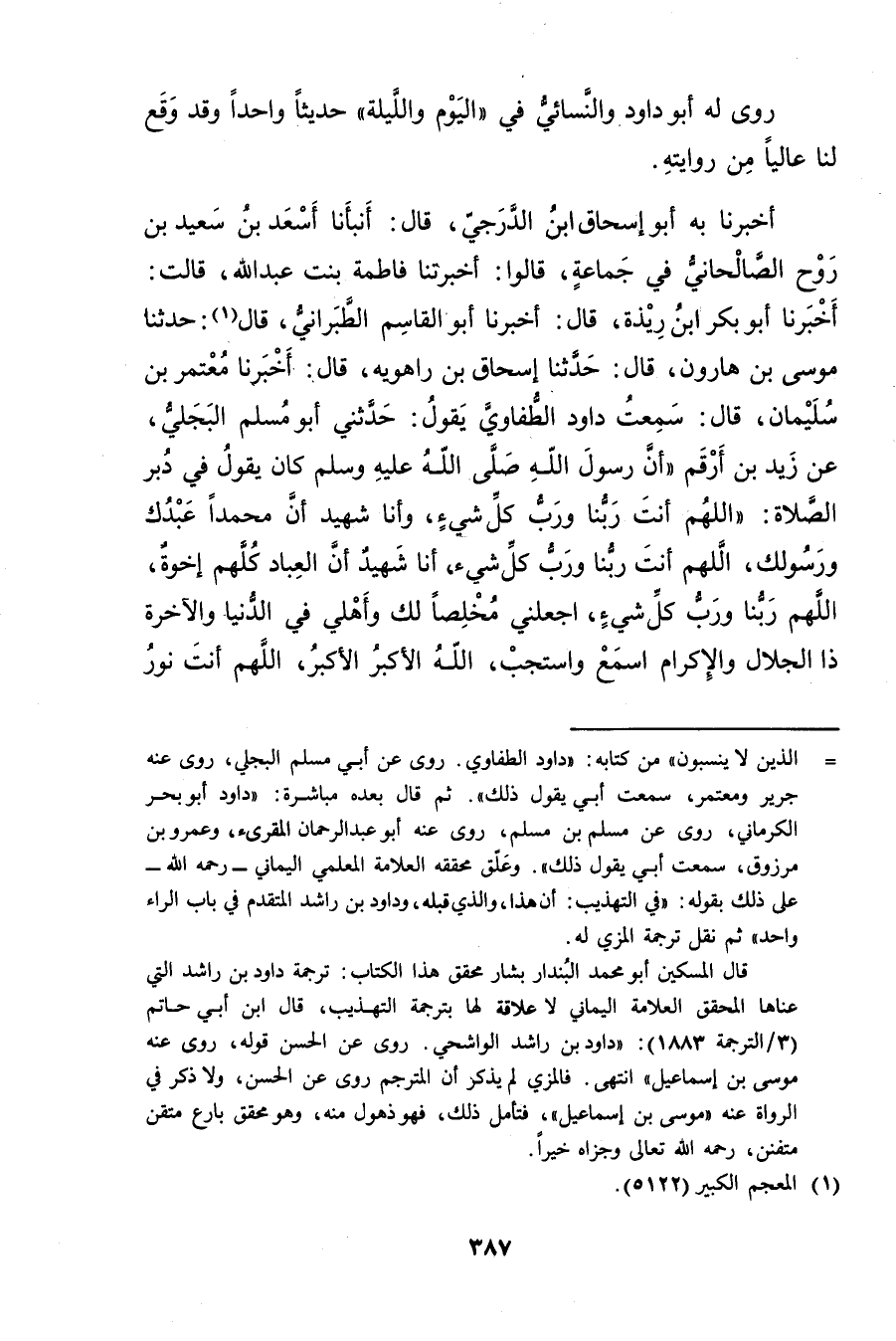 أخبرنا به أَبُو إِسْحَاقَ ابن الدَّرَجِيِّ، قال: أَنْبَأَنَا أَسْعَدُ بْنُ سَعِيد بْنِ رَوْحٍ الصَّالَحَانِيُّ فِي جَمَاعَةٍ، قَالُوا: أَخْبَرَتْنا فَاطِمَةُ بِنْتُ عَبد اللَّهِ، قال: أخبرنا أَبُو بَكْرِ بْنُ رِيذَةَ، قال: أخبرنا أَبُو الْقَاسِمِ الطَّبَرَانِيُّ، قال (1) : حَدَّثَنَا موسى بْن هارون، قال: حَدَّثَنَا إِسْحَاقُ بْنُ رَاهَوَيْهِ، قال: أَخْبَرَنَا مُعَتِمُرُ بْنُ سُلَيْمان، قال: سَمِعْتُ دَاوُدَ الطَّفَّاوِيُّ، يَقُولُ: حَدَّثَنِي أَبُو مُسْلِمٍ الْبَجْلِيُّ، عَنْ زَيْدِ بْنِ أَرْقَمَ"أَنَّ رَسُولَ اللَّهِ صَلَّى اللَّهُ عَلَيْهِ وسَلَّمَ كَانَ يَقُولُ فِي دُبُرِ الصَّلاةِ"اللَّهُمَّ أَنْتَ رَبُّنَا ورَبُّ كُلِّ شَيْءٍ، وأَنَا شَهِيدٌ أَنَّ مُحَمَّدًا عَبْدُكَ ورُسُولُكَ، اللَّهُمَّ أَنْتَ رَبُّنَا ورَبُّ كُلِّ شَيْءٍ، أَنَا شَهِيدٌ أَنَّ الْعِبَادَ كُلُّهُمْ أُخْوَةٌ، اللَّهُمَّ رَبُّنَا ورَبُّ كُلِّ شَيْءٍ، اجْعَلْنِي مُخْلِصًا لَكَ وأَهْلِي فِي الدُّنْيَا والآخِرَةِ ذَا الْجَلالِ والإِكْرَامِ اسْمَعْ واسَتِجِبْ، اللَّهُ الأَكْبَرُ الأَكْبَرُ، اللَّهُمَّ أَنْتَ نُورُ