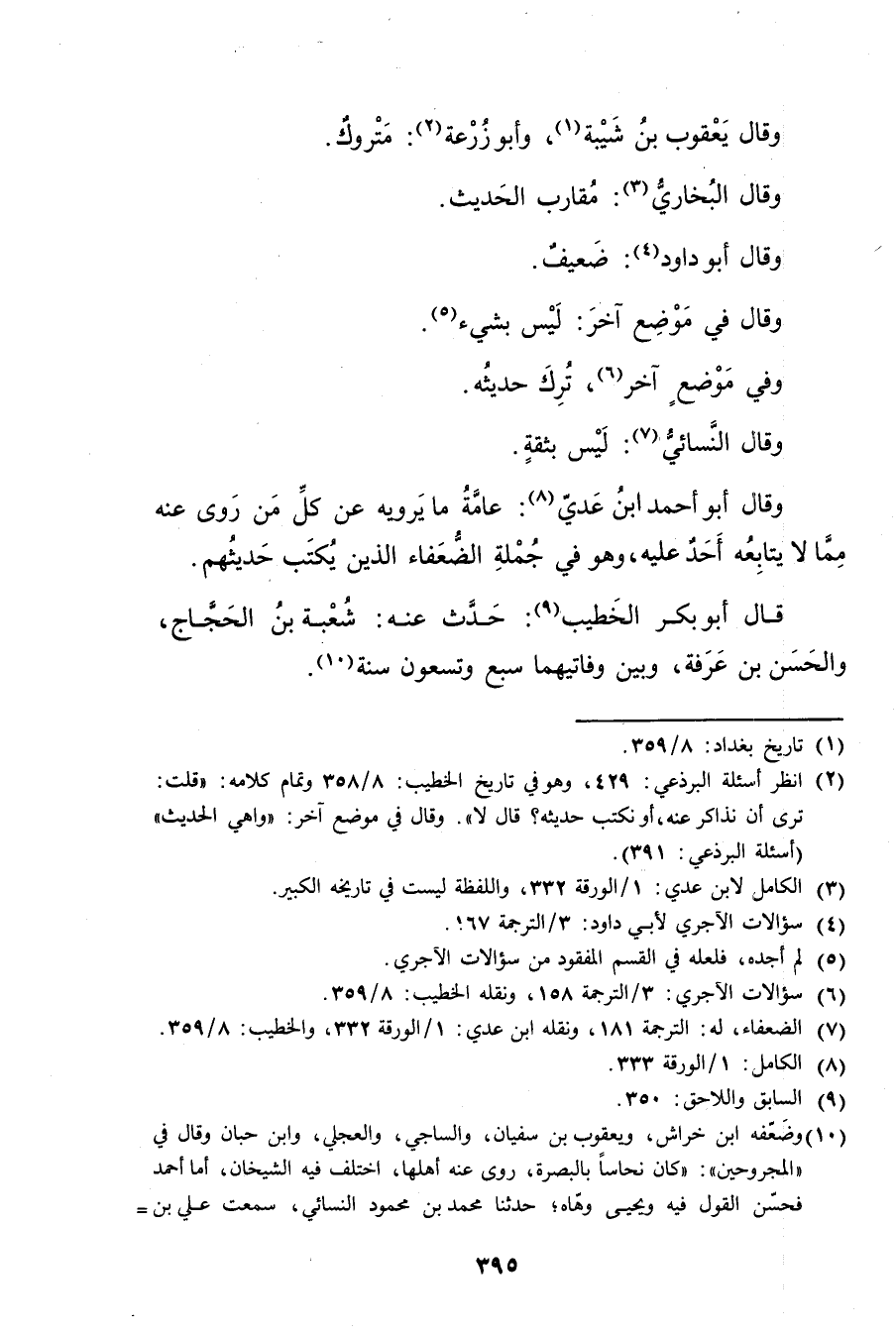 (7) الضعفاء، له: الترجمة 181، ونقله ابن عدي: 1 / الورقة 332، والخطيب: 8 / 359.