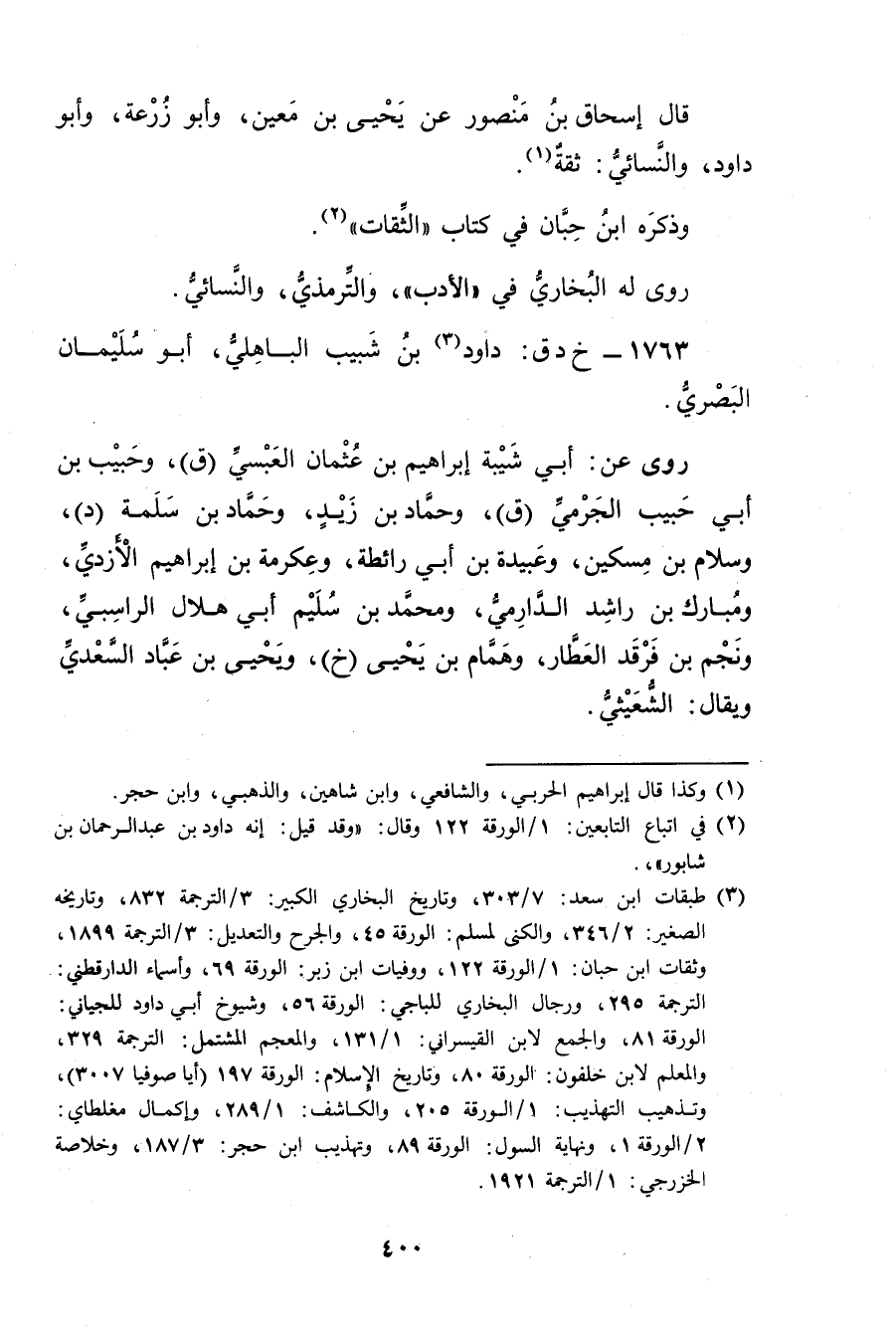(3) طبقات ابن سعد: 7 / 303، وتاريخ البخاري الكبير: 3 / الترجمة 832، وتاريخه الصغير: 2 / 346، والكنى لمسلم: الورقة 45، والجرح والتعديل: 3 / الترجمة 1899، وثقات ابن حبان: 1 / الورقة 122، ووفيات ابن زبر: الورقة 69، وأسماء الدَّارَقُطنِيّ: الترجمة 295، ورجال البخاري للباجي: الورقة 56، وشيوخ أبي داود للجياني: الورقة 81، والجمع لابن القيسراني: 1 / 131، والمعجم المشتمل: الترجمة 329، والمعلم لابن خلفون: الورقة 80، وتاريخ الاسلام: الورقة 197 (أيا صوفيا 3007) ، وتذهيب التهذيب: 1 / الورقة 205، والكاشف: 1 / 289، وإكمال مغلطاي: 2 / الورقة 1، ونهاية السول: الورقة 89، وتهذيب ابن حجر: 3 / 187، وخلاصة الخزرجي: 1 / الترجمة 1921.