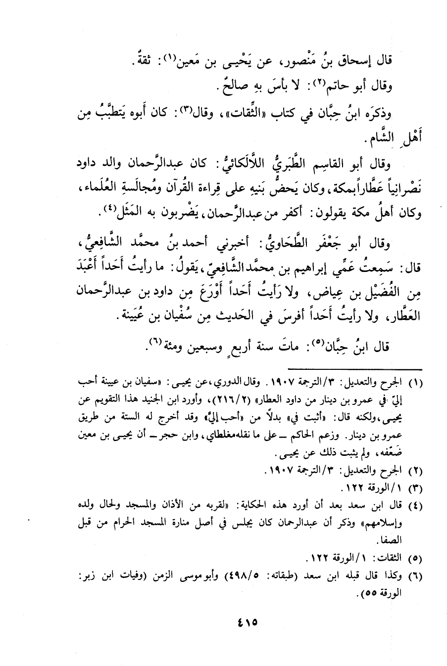 (4) قال ابن سعد بعد أن أورد هذه الحكاية: لقرية من الاذان والمسجد ولحال ولده وإسلامهم"وذكر أن عبد الرحمن كان يجلس في أصل منارة المسجد الحرام من قبل الصفا.