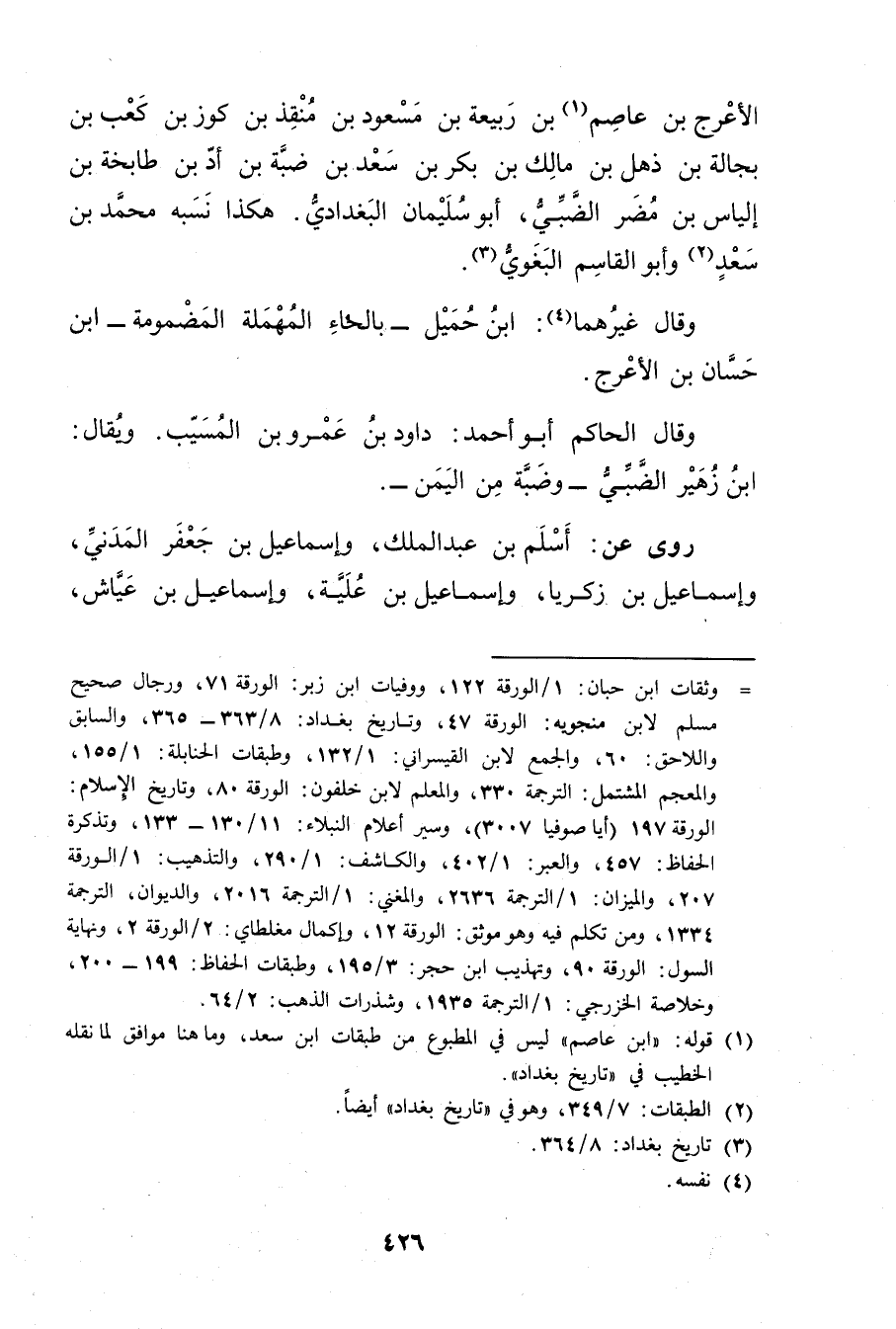 = وثقات ابن حبان: 1 / الورقة 122، ووفيات ابن زبر: الورقة 71، ورجال صحيح مسلم لابن منجويه: الورقة 47، وتاريخ بغداد: 8 / 363 - 365، والسابقواللاحق: 60، والجمع لابن القيسراني: 1 / 132 وطبقات الحنابلة: 1 / 155، والمعجم المشتمل: الترجمة 330، والمعلم لابن خلفون: الورقة 80، وتاريخ الاسلام: الورقة 197 (أيا صوفيا 3007) وسير أعلام النبلاء: 11 / 130 - 133، وتذكرة الحفاظ: 457، والعبر: 1 / 402، والكاشف: 1 / 290، والتذهيب: 1 / الورقة 207، والميزان: 1 / الترجمة 2636، والمغني: 1 / الترجمة 2016، والديوان، الترجمة 1334، ومن تكلم فيه وهو موثق: الورقة 12، وإكمال مغلطاي: 2 / الورقة 2، ونهاية السول: الورقة 90، وتهذيب ابن حجر: 3 / 195، وطبقات الحفاظ: 199 - 200، وخلاصة الخزرجي: 1 / الترجمة 1935، وشذرات الذهب: 2 / 64، (1) قوله: ابن عاصم"ليس في المطبوع من طبقات ابن سعد، وما هنا موافق لما نقله الخطيب في "تاريخ بغداد.