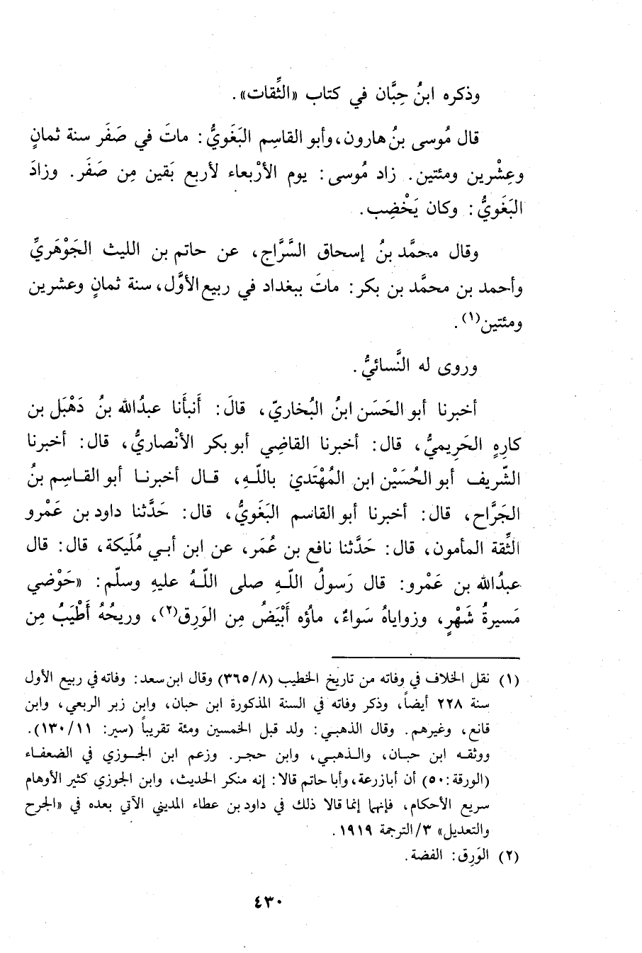 (1) نقل الخلاف في وفاته من تاريخ الخطيب (8 / 365) وَقَال ابن سعد: وفاته في ربيع الاول سنة 228، أيضا، وذكر وفاته في السنة المذكورة ابن حبان، وابن زبر الربعي وابن قانع، وغيرهم. وَقَال الذهبي: ولد قبل الخمسين ومئة تقريبا (سير: 11 / 130) .ووثقه ابن حبان، والذهبي، وابن حجر. وزعم ابن الجوزي في الضعفاء (الورقة: 50) أن أبا زرعة، وأبا حاتم قالا: إنه منكر الحديث، وابن الجوزي كثير الأَوهام سريع الاحكام، فإنهما إنما قالا ذلك في داود بن عطاء المديني الآتي بعده في "الجرح والتعديل"3 / الترجمة 1919.