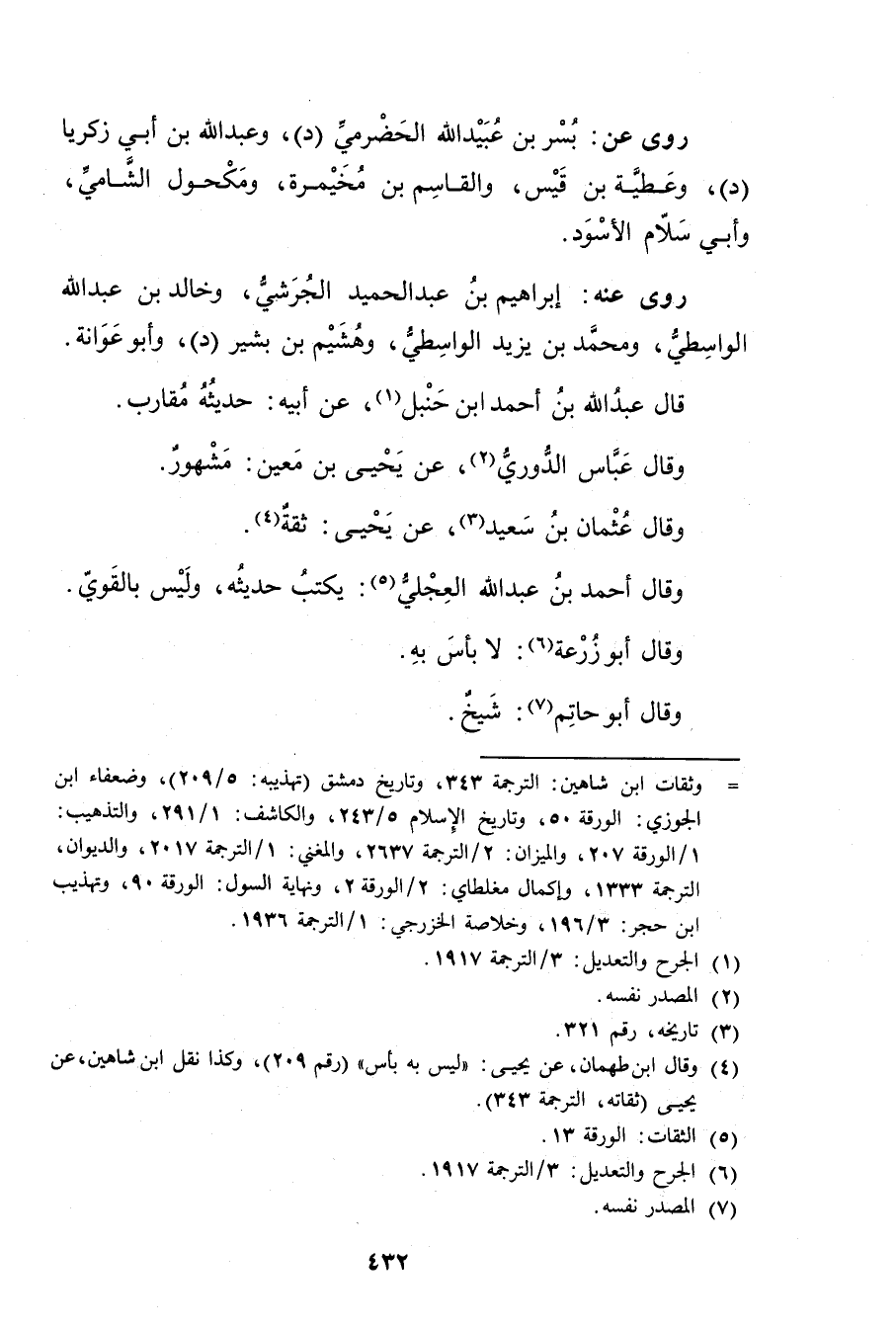 = وثقات ابن شاهين: الترجمة 343، وتاريخ دمشق (تهذيبه: 5 / 209) ، وضعفاء ابن الجوزي: الورقة 50، وتاريخ الاسلام: 5 / 243، والكاشف: 1 / 291، والتذهيب: 1 / الورقة 207، والميزان: 2 / الترجمة 2637، والمغني: 1 / الترجمة 2017، والديوان، الترجمة 1333، وإكمال مغطاي: 2 / الورقة 2، ونهاية السول: الورقة 90، وتهذيب ابن حجر: 3 / 196، وخلاصة الخزرجي: 1 / الترجمة 1936.