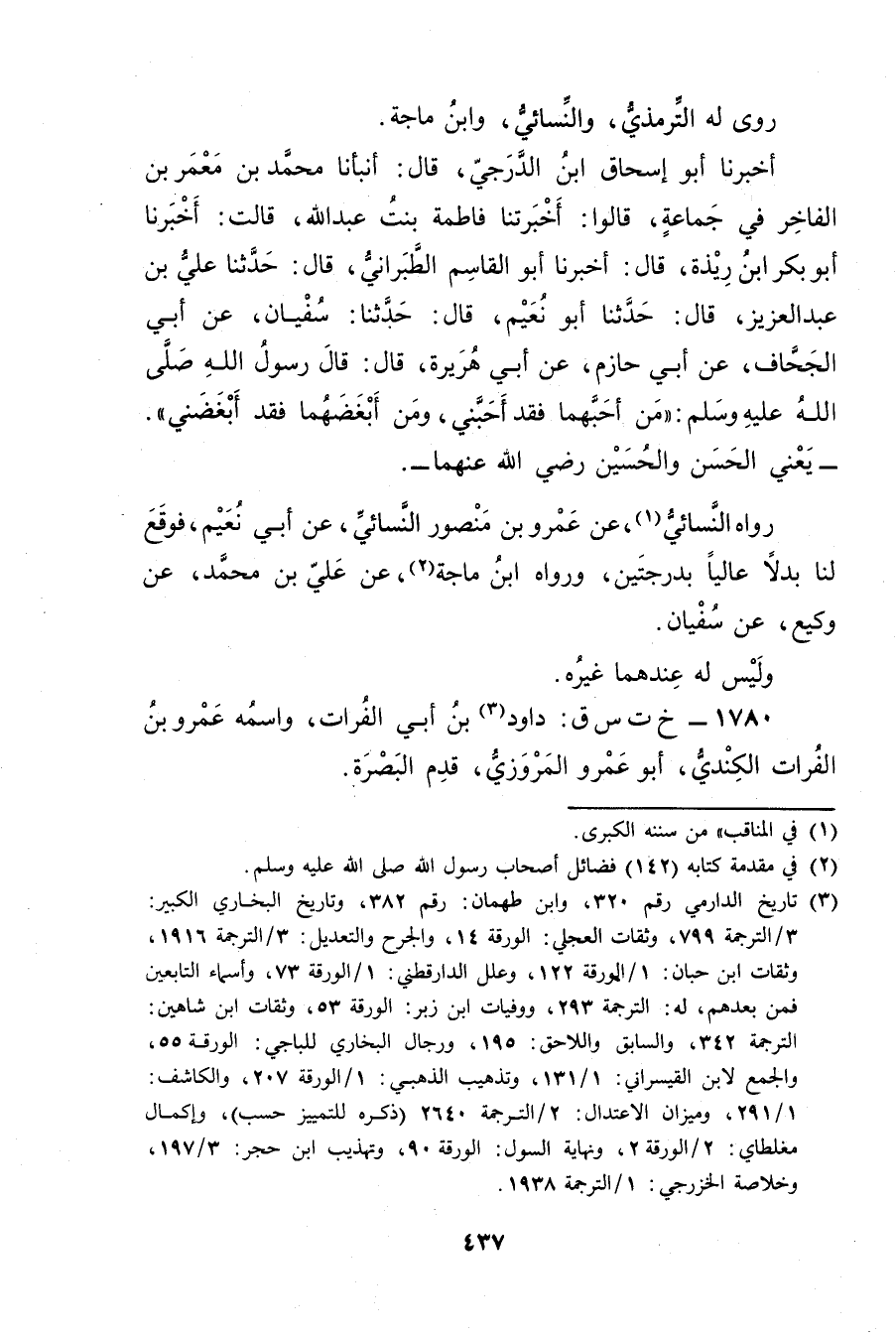 قال: حَدَّثَنَا أَبُو نعيم، قال: حَدَّثَنَا: سفيان، عَن أَبِي الْجُحَافِ، عَن أَبِي حَازِمٍ، عَن أَبِي هُرَيْرة، قال: قال رَسُولُ اللَّهِ صلى الله عَلَيْهِ وسَلَّمَ: مَنْ أَحَبَّهُمَا فَقَدْ أَحَبَّنِي، ومَنْ أَبْغَضَهُمَا فَقَدْ أَبْغَضَنِي".، يعني الْحَسَن والحسين رضي الله عنهما -.