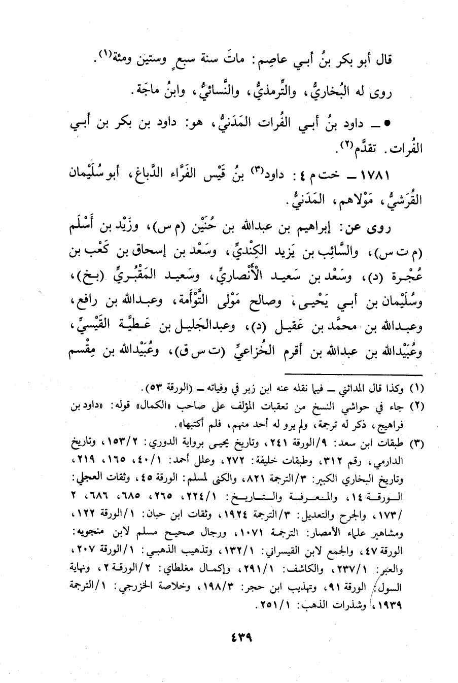 (2) جاء في حواشي النسخ من تعقبات المؤلف على صاحب "الكمال" قوله: داود بن فراهيج، ذكره له ترجمة ولم يرو له أخذ منهم فلم أكتبها.