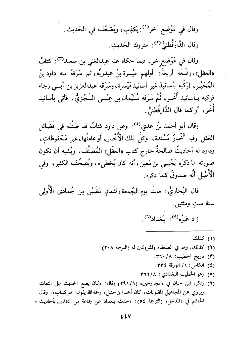 وَقَال أَبُو أحمد بن عدي (4) : وعن داو دكتاب قد صنفه في فضائبل العقل وفيه أخبار مسدة، وكل تلك الأخبار، أو عامتها، غير محفوظات.
