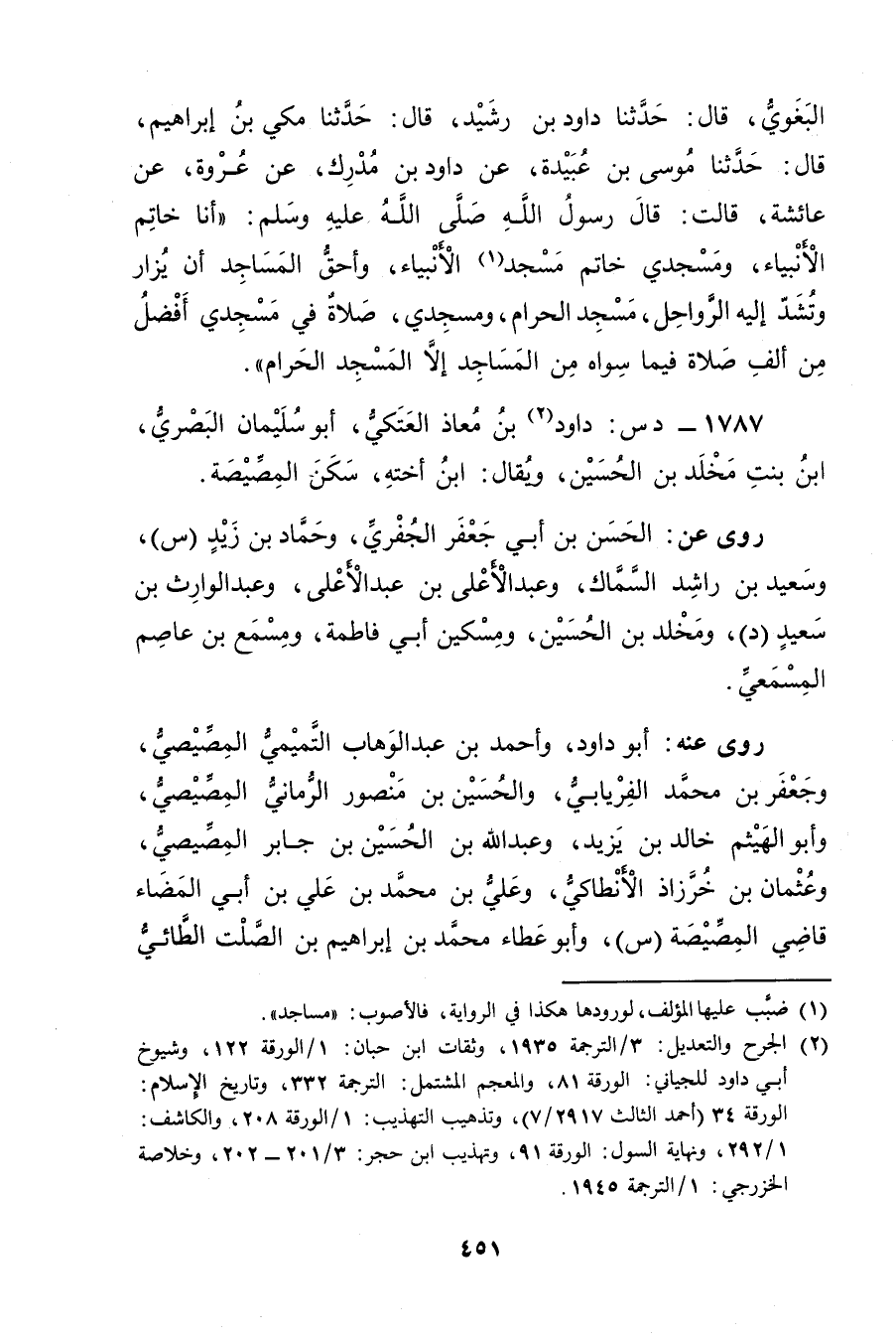 1787 - د س: دَاوُد بن معاذ العتكي (2) ، أَبُو سُلَيْمان البَصْرِيّ، ابْن بنت مخلد بْن الْحُسَيْن، ويُقال: ابن أخته، سكن المصيصة.