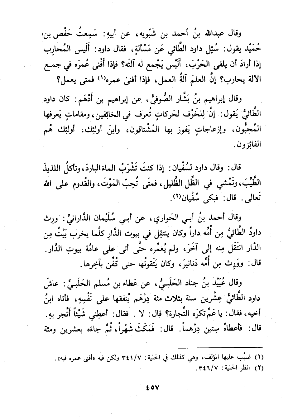 وَقَال عُبَيد بْن جناد الحلبي, عَنْ عطاء بْن مسلم الحلبي: عاش دَاوُد الطائي عشرين سنة بثلاث مئة درهم ينفقها عَلَى نفسه، فأتاه ابْن أخيه، فقَالَ: يا عم تكره التجارة؟ قال: لا. فقَالَ: اعطني شيئا اتجر بِهِ.