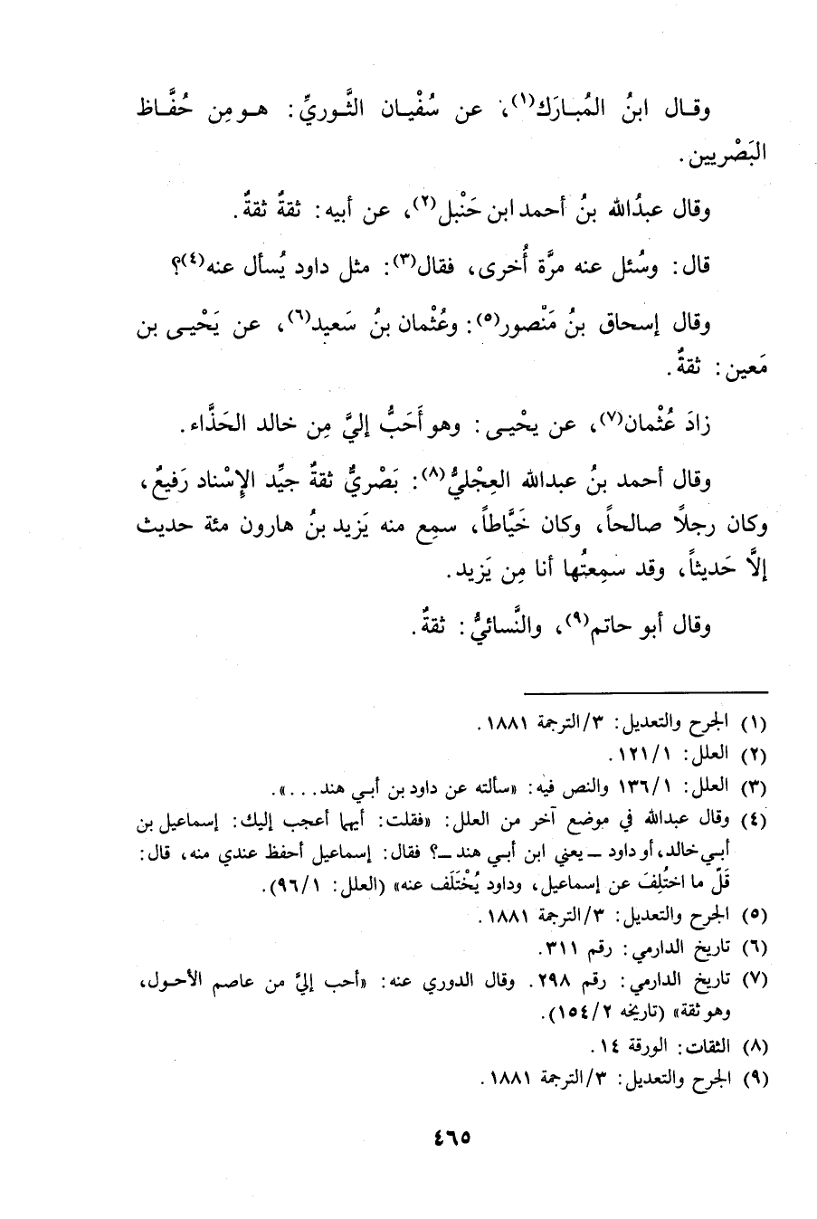 (7) تاريخ الدارمي: رقم 298، وَقَال الدوري عَنه: أحب إلي من عاصم الأحول، وهو ثقة" (تاريخه 2 / 154) .