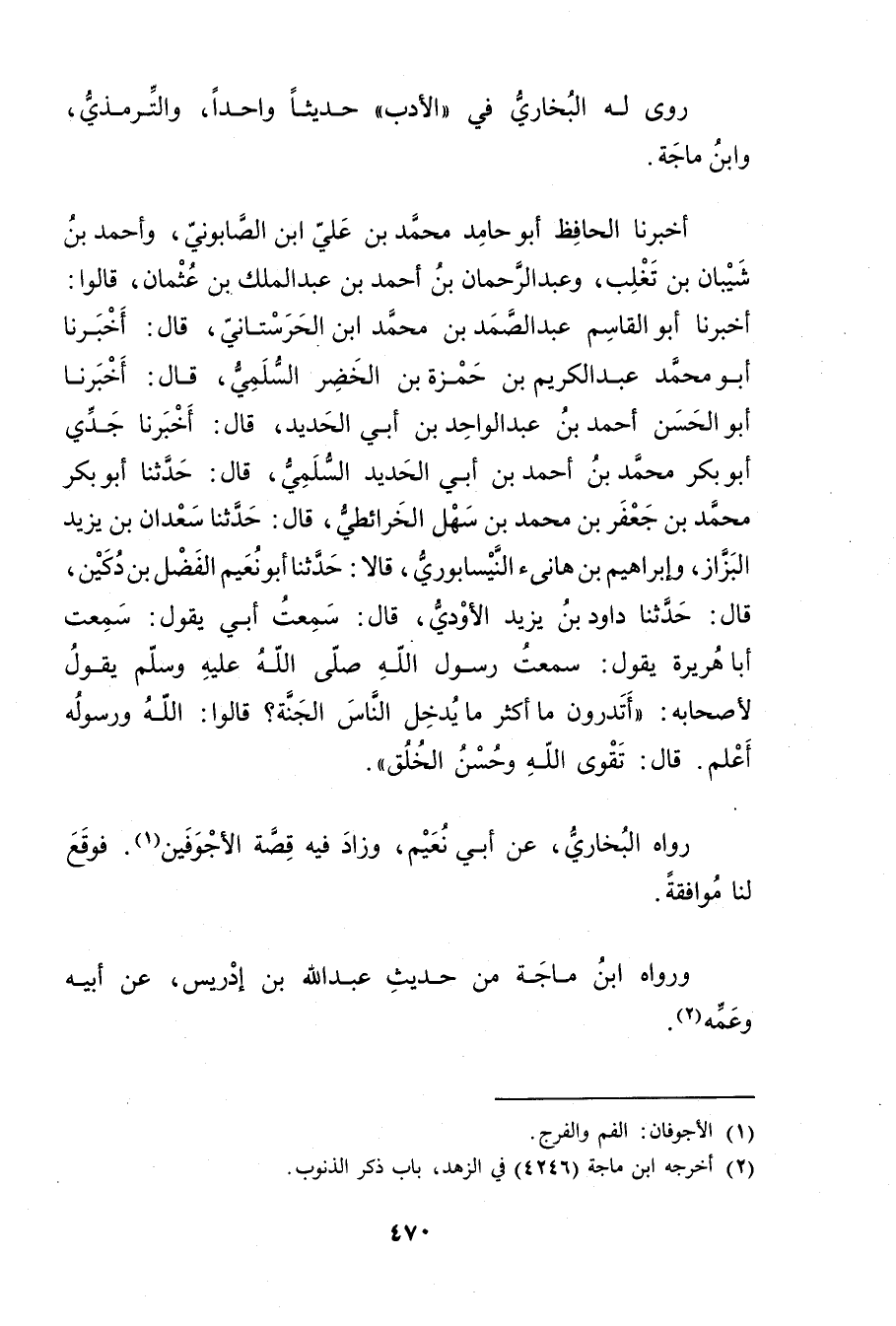 أَخْبَرَنَا الْحَافِظ أَبُو حامد مُحَمَّد بن علي ابن الصَّابُونِيِّ، وأَحْمَدُ بْنُ شَيْبَانَ بْنِ تَغْلَبٍ، وعَبْدُ الرَّحْمَنِ بْنُ أَحْمَدَ بْنِ عَبد المَلِك بْنِ عُثْمَانَ، قَالُوا: أَخْبَرَنَا أَبُو الْقَاسِمِ عَبْدُ الصمد بن محمد ابْنُ الْحَرَسْتَانِيِّ. قال: أَخْبَرَنَا أَبُو مُحَمَّد عبد الكريم بْن حمزة بْنِ الْخِضْرِ السَّلْمِيُّ، قال: أَخْبَرَنَا أَبُو الْحَسَنِ أَحْمَدُ بْنُ عَبْدِ الْوَاحِدِ بْنِ أَبي الْحَدِيدِ، قال: أَخْبَرَنَا جَدِّي أَبُو بَكْرٍ مُحَمَّدُ بْنُ أَحْمَدَ بْنِ أَبي الْحَدِيدِ السَّلْمِيُّ، قال: حَدَّثَنَا أَبُو بَكْر مُحَمَّد بْن جَعْفَر بْن مُحَمَّد بْنِ سَهْلٍ الْخَرَائِطِيُّ، قال: حَدَّثَنَا سَعْدَانُ بْنُ يَزِيدَ الْبَزَّازُ، وإِبْرَاهِيمُ بْنُ هَانِئِ النَّيْسَابُورِيُّ، قَالا: حَدَّثَنَا أَبُو نعيم الفضل بْن دكين، قال: حَدَّثَنَا دَاوُدُ بْنُ يَزِيدَ الأَودِيّ، قال: سَمِعْتُ أَبِي يَقُولُ: سَمِعْتُ أَبَا هُرَيْرة يَقُولُ: سَمِعْتُ رَسُول اللَّهِ صلى الله عليه وسَلَّمَ يَقُولُ لأَصْحَابِهِ"أَتَدْرُونَ مَا أَكْثَرُ مَا يُدْخِلُ النَّاسَ الْجَنَّةَ؟ قَالُوا: اللَّهُ ورَسُولُهُ أَعْلَمُ. قال: تَقْوَى اللَّهِ وحُسُنُ الْخُلُقِ.