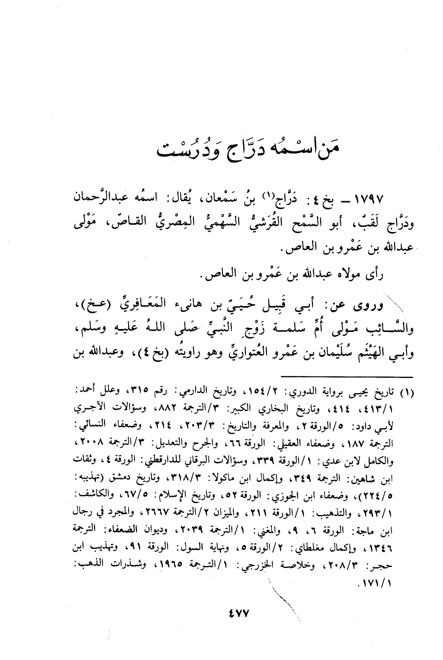 1797 - بخ 4: دراج بن سمعان (1) ، يقَالَ: اسمه عَبْد الرَّحْمَنِ ودراج لقب، أَبُو السمح القرشي السهمي المِصْرِي القاص، مولى عَبد الله بْن عَمْرو بْن العاص.