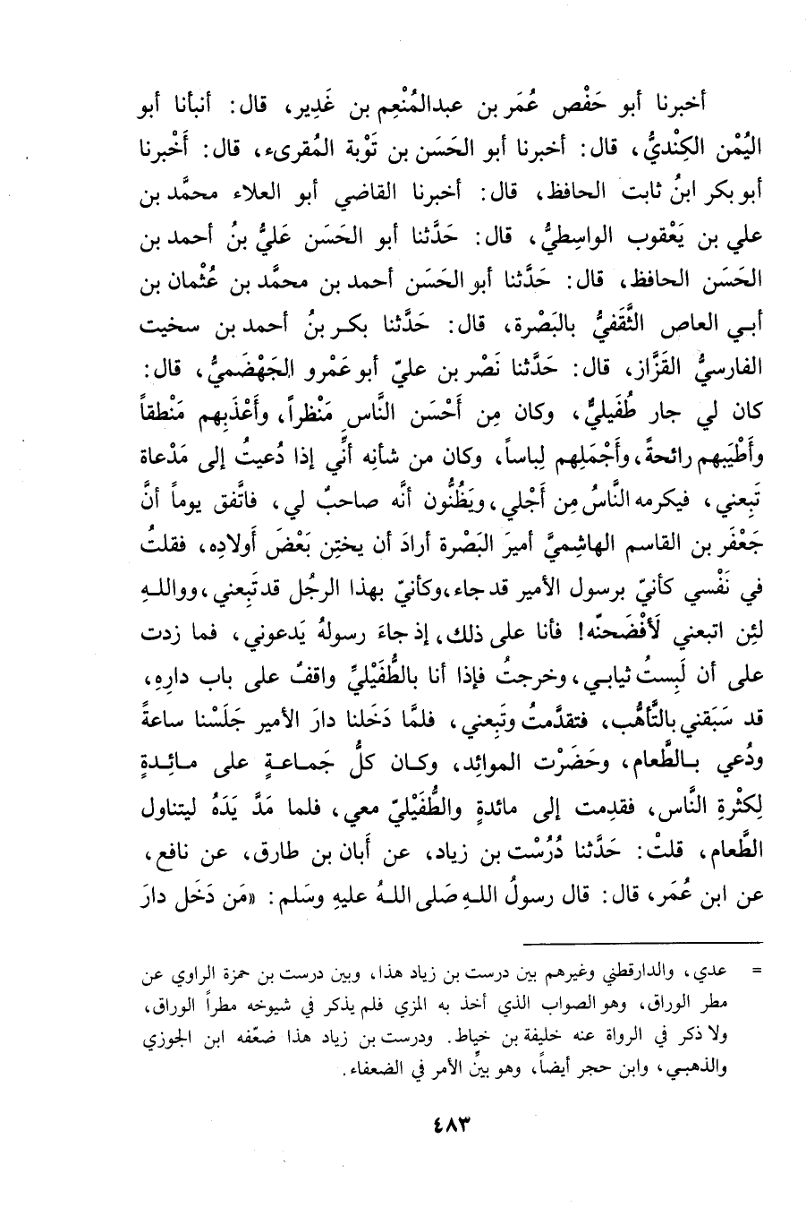 أَخْبَرَنَا أَبُو حَفْص عُمَر بْن عبد المنعم بْن غدير، قال: أَنْبَأَنَا أَبُو اليُمْنِ الكندي, قال: أَخْبَرَنَا أَبُو الْحَسَنِ بْن توبة المقرئ، قال: أَخْبَرَنَا أَبُو بَكْرِ بْن ثابت الحافظ، قال: أَخْبَرَنَا القاضي أَبُو العلاء مُحَمَّد بْن عَلِيِّ بْن يعقوب الواسطي، قال: حَدَّثَنَا أبو الحسن علي بْن أَحْمَدَ بْن الْحَسَن الْحَافِظ، قال: حَدَّثَنَا أَبُو الْحَسَنِ أَحْمَدُ بْن مُحَمَّدُ بْنُ عُثْمَانَ بْنِ أَبي العاص الثقفي بالبصرة، قال: حَدَّثَنَا بكر بْن أَحْمَدَ بْن سخيت الفارسي القزاز، قال: حَدَّثَنَا نصر بْن عَلِيٍّ أَبُو عَمْرو الجهضمي، قال: كان لي جار طفيلي, وكان من أحسن الناس منظرا، وأعذبهم منطقا وأطيبهم رائحة، وأجملهم لباسا، وكان من شأنه أني إذا دعيت إِلَى مدعاة تبعني، فيكرمه الناس من أجلي، ويظنون أَنَّهُ صاحب لي، فاتفق يوما أن جَعْفَر بْن الْقَاسِم الهاشمي أمير البصرة أراد ين يختن بعض أولاده، فقلت فِي نفسي كأني برسول الأمير قد جاء وكأني بهذا الرجل قد تبعني، ووالله لئن اتبعني لأفضحنه! فأنا عَلَى ذلك، إذ جاء رسوله يدعوني، فما زدت على نأ لبست ثيابي، وخرجتة فإذا أنا بالطفيلي، واقف عَلَى باب داره، قد سبقني بالتأهب، فتقدمت وتبعني، فلما دخلنا دار الأمير جلسنا ساعة ودعي بالطعام، وحضرت الموائد، وكان كل جماعة عَلَى مائدة لكثرة الناس، فقدمت إِلَى مائدة والطفيلي معي، فلما مد يده ليتناول الطعام، قلت: حَدَّثَنَا درست بْن زياد، عَنْ أبان بْن طارق، عَنْ نافع، عَنِ ابْنِ عُمَر، قال: قال رَسُول اللَّهِ صلى الله عليه وسلم: من دخل دار