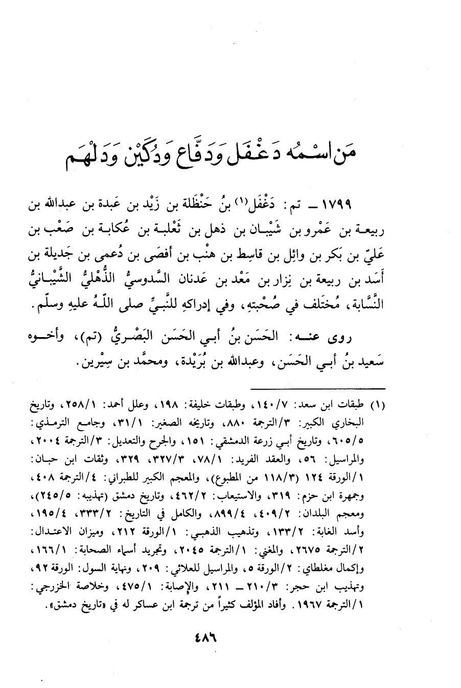 1799 - تم: دغفل بن حنظلة بن زيد بن عبدة بن عَبد اللَّهِ بن ربيعة بن عَمْرو (1) بن شيبان بن ذهل بْن ثعلبة بْن عكابة بْن صعب بْن علي بْن بَكْر بْن وائل بْن قاسط بْن هنب بْن أفصى بْن دعمي بْن جديلة بْن أسد بْن ربيعة بْن نزار بْن معد بن عدنان السدوسي الذهلي الشيباني النسابة، مختلف فِي صحبته, وفي إدراكه للنبي صَلَّى اللَّهُ عليه وسلم.