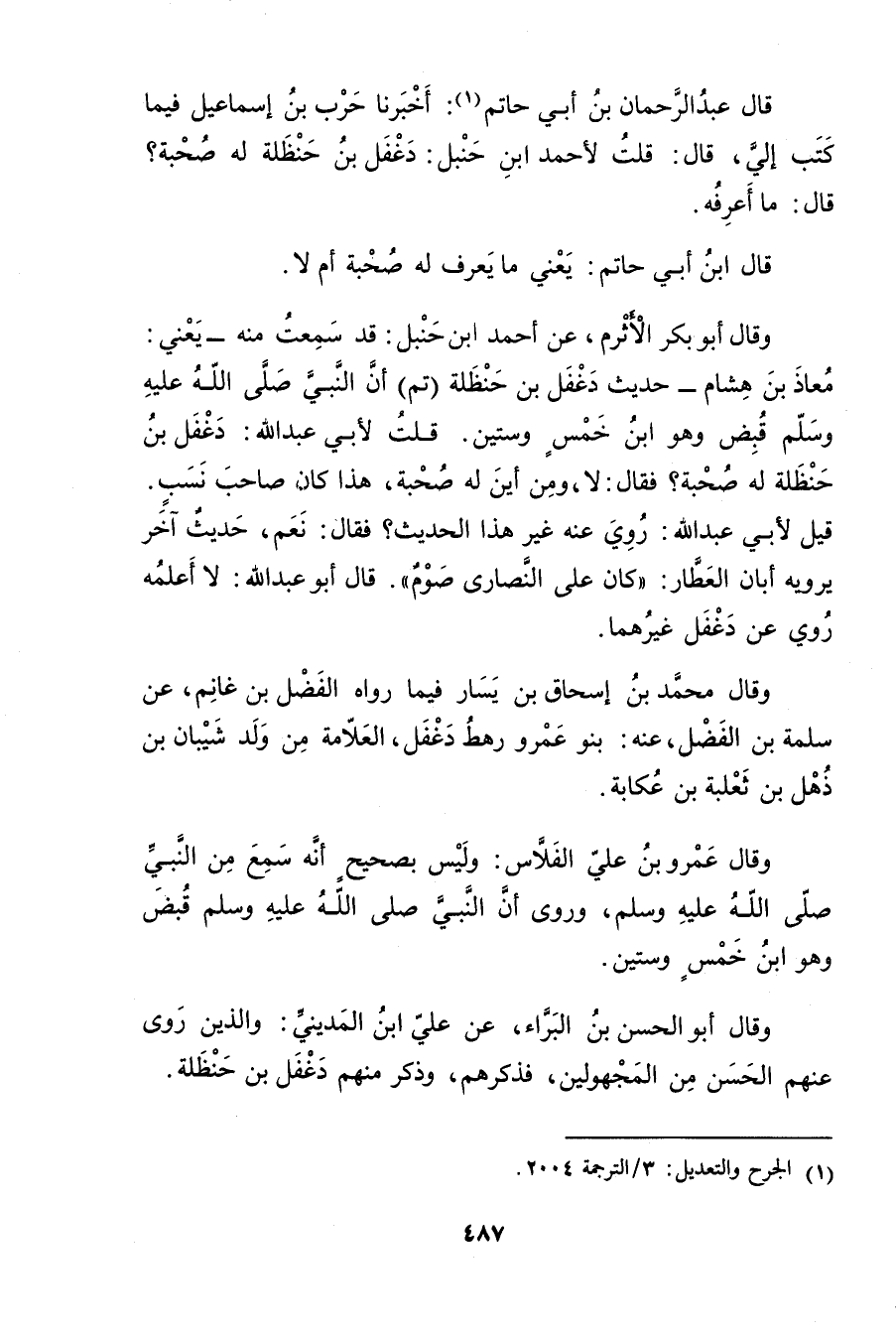 قال عَبْد الرَّحْمَنِ بْن أَبي حاتم (1) : أَخْبَرَنَا حرب بْن إِسْمَاعِيلَ فيما كتب إلي، قال: قلت لأحمد بْن حَنْبَلٍ: دغفل بْن حنظلة لهُ صُحبَةٌ؟ قال: ما أعرفه.