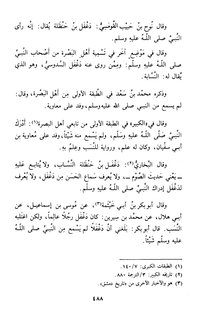 وَقَال فِي موضع آخر فِي تسمية أهل البصرة من أصحاب النَّبِيّ صَلَّى اللَّهُ عليه وسلم: وممن روى عنه دغفل السدوسي، وهو الذي يقَالَ لَهُ: النسابة.