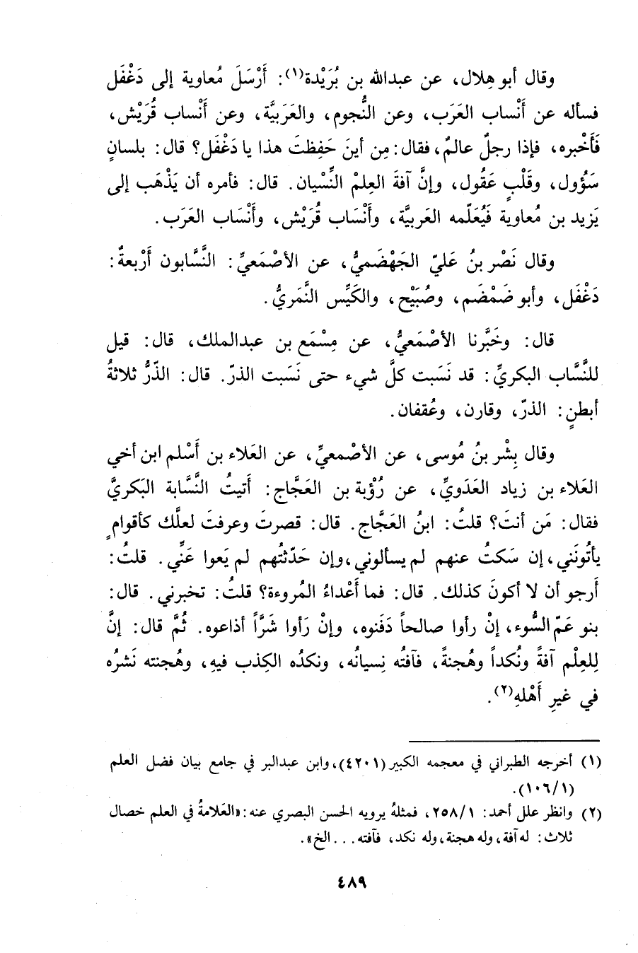 وَقَال بشر بْن موسى، عَنِ الأَصْمَعِيّ، عَنِ العلاء بْن أسلم ابْن أخي العلاء بْن زياد العدوي، عَنْ رؤبة بْن العجاج: أتيت النسابة البكري فقَالَ: من أنت؟ قلت: ابن العجاج, قال: قصرت وعرفت لعلك كأقوام يأتونني، إن سكت عنهم لم يسألوني وإن حدثتهم لم يعوا عني. قلت: أرجو أن لا أكون كذلك، قال: فما أعداء المروءة؟ قلت: تخبرني، قال: بنو عم السوء، إن رأوا صالحا دفنوه، وإن رأوا شرا أذاعوه، ثم قال: إن للعلم آفة ونكدا وهجنة، فآفته نسيانه، ونكده الكذب فيه، وهجنته نشره في غير أهله (2) .