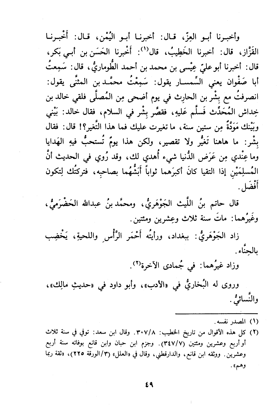 وأَخْبَرَنَا أَبُو العز، قال: أَخْبَرَنَا أَبُو اليمن. قال: أَخْبَرَنَا القزاز، قال: أَخْبَرَنَا الخطيب، قال (1) : أَخْبَرَنَا الْحَسَن بْن أَبي بَكْرٍ، قال: أَخْبَرَنَا عَلِيّ عيسى بْن مُحَمَّد بْن أَحْمَدَ الطوماري، قال: سمعت أبا صفوان يعني السمسار يقول: سمعت مُحَمَّد بْن المثنى يقول: انصرفت مع بشر بْن الحارث فِي يوم أضحى من المصلى فلقي خالد بْن خداش المحدث فسلم عليه، فقصر بشر فِي السلام، فقَالَ خالد: بيني وبينك مودة من ستين سنة. ما تغيرت عليك فما هذا التغير؟ ! قال: فقَالَ بشر: ما هاهنا تغير ولا تقصير، ولكن هذا يوم تستحب فيه الهدايا وما عندي من عرض الدنيا شيء أهدي لك.