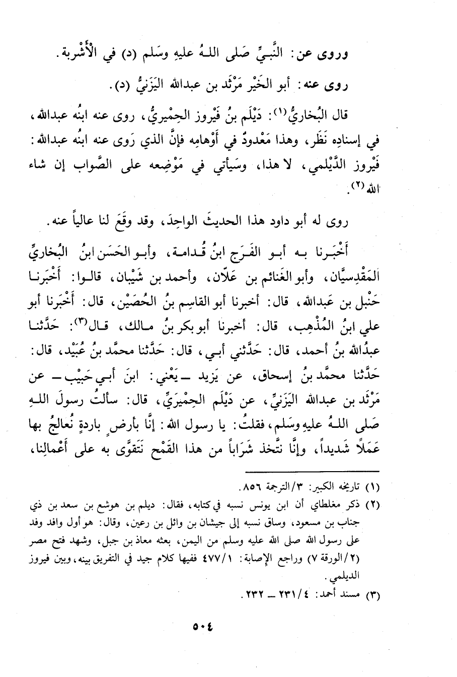 أَخْبَرَنَا به أبو الفرج ابن قُدَامَةَ، وأَبُو الْحَسَنِ بْنُ الْبُخَارِيِّ الْمَقْدِسِيَّانِ، وأَبُو الْغَنَائِمِ بْنُ عَلانَ، وأَحْمَدُ بْنُ شَيْبَانَ، قَالُوا: أَخْبَرَنَا حنبل بْن عَبد الله، قال: أَخْبَرَنَا أبو القاسم بْن الحصين، قال: أَخْبَرَنَا أَبُو عَلِيِّ ابْنُ الْمُذْهِب، قال: أَخْبَرَنَا أبو بكر بْن مالك قال (3) : حَدَّثَنَا عَبد اللَّهِ بْن أَحْمَدَ، قال: حَدَّثني أَبِي، قال: حَدَّثَنَا مُحَمَّدُ بْنُ عُبَيد، قال: حَدَّثَنَا مُحَمَّدُ بْنُ إِسْحَاقَ، عَنْ يَزِيدَ، يَعْنِي: ابْنَ أَبي حَبِيبٍ، عَن مَرْثَدِ بْنِ عَبد اللَّهِ الْيَزَنِيِّ، عَنْ دَيْلَمَ الْحَمِيرِيِّ، قال: سَأَلْتُ رَسُولَ اللَّهِ صَلَّى اللَّهُ عَلَيْهِ وسَلَّمَ فَقُلْتُ: يَا رَسُولَ اللَّهِ: إِنَّا بِأَرْضٍ بَارِدَةٍ نُعَالِجُ بِهَا عَمَلا شَدِيدًا، وإِنَّا نَتَخِذُ شَرَابًا مِنْ هَذَا الْقَمْحِ نَتَقَوَّى بِهِ عَلَى أَعْمَالِنَا.