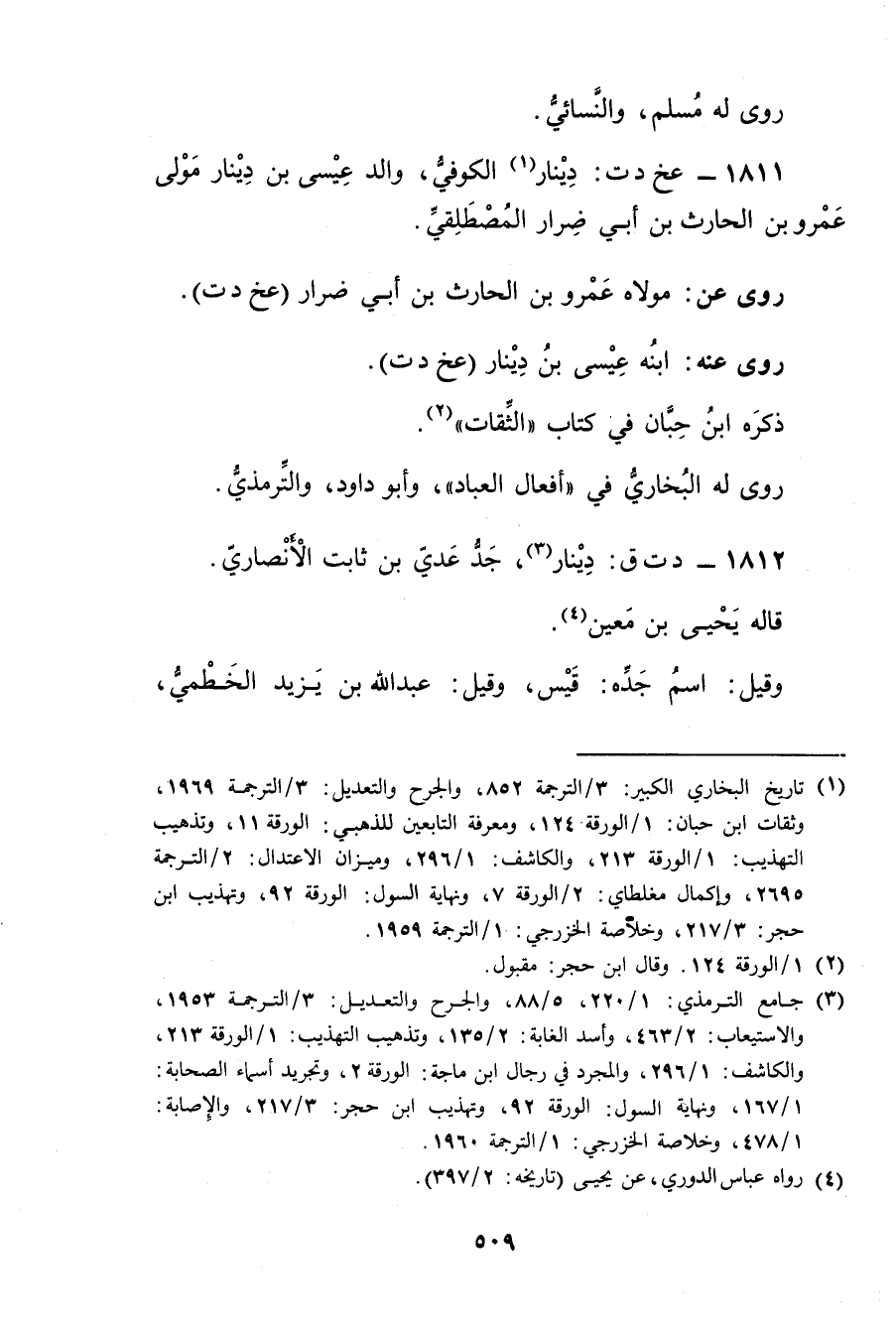 1811 - عخ دت: دينار الكوفي (1) ، والد عِيسَى بْن دينار مولى عَمْرو بْن الحارث بْن أَبي ضرار المصطلقي.