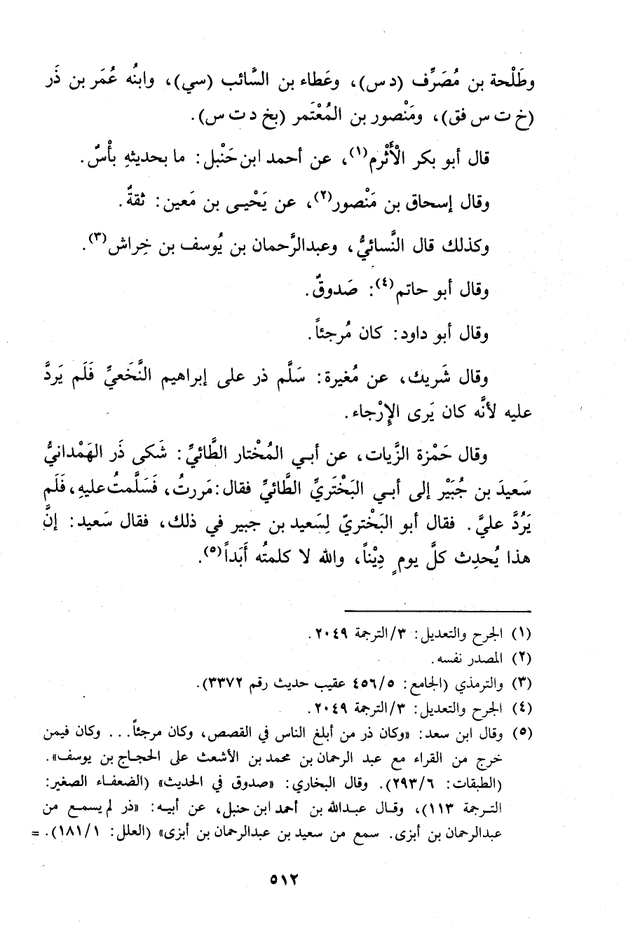 (5) وَقَال ابن سعد: وكان ذر من أبلغ الناس في القصص، وكان مرجئا ... وكان فيمن خرج من القراء مع عبد الرحمن بْن مُحَمَّد بن الاشعث على الحجاج بن يوسف". (الطبقات: 6 / 293) وقَال البُخارِيُّ: صدوق في الحديث" (الضعفاء الصغير: الترجمة 113) وَقَال عَبد اللَّهِ بْن أَحْمَد بن حنبل، عَن أبيه ز"ذر لم يسمع من عَبْد الرَّحْمَن بن أبزى، سمع من سَعِيد بْن عَبْد الرَّحْمَنِ بْن أبزى" (العلل: 1 / 181) .