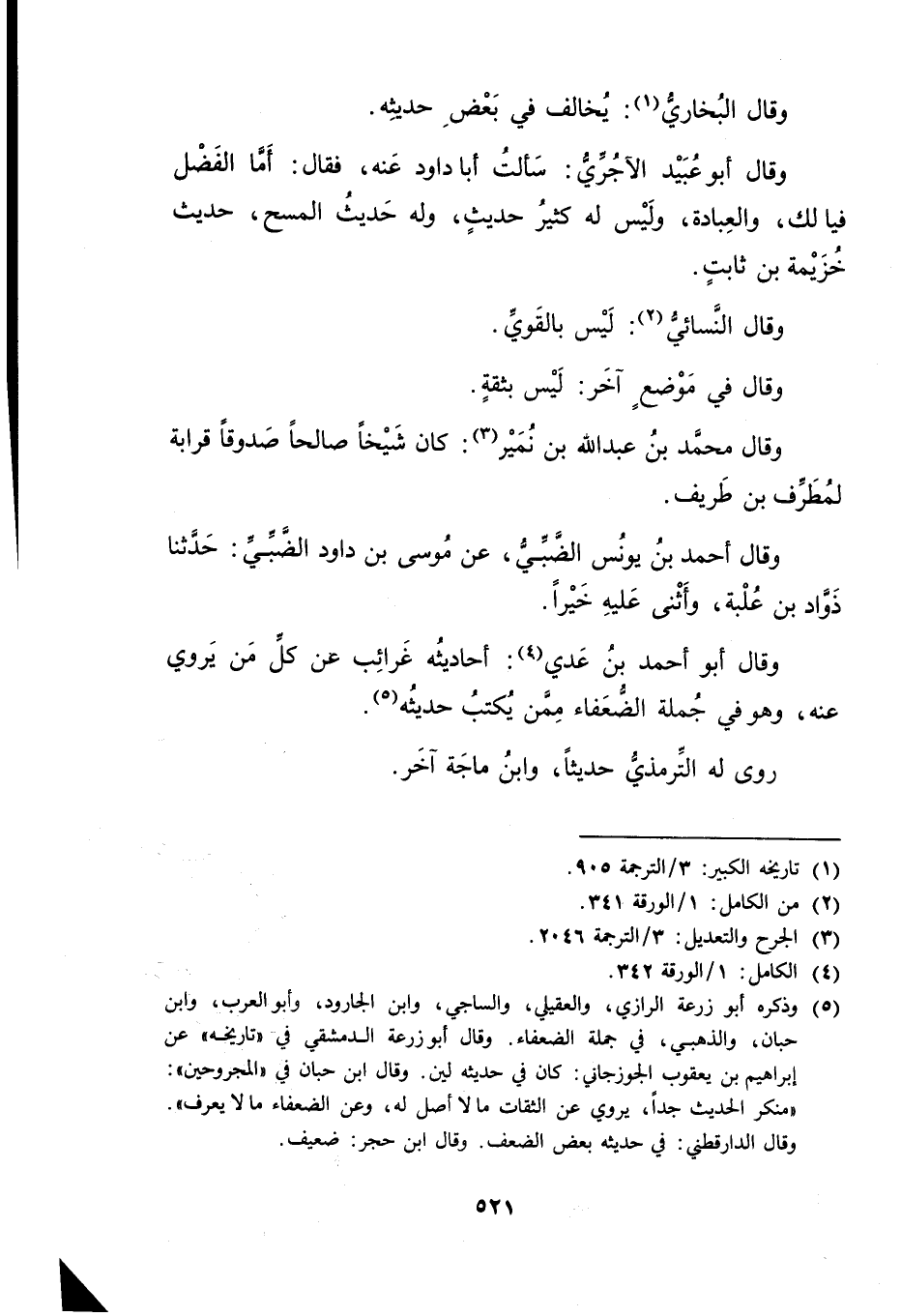 (5) وذكره أبو زُرْعَة الرازي، والعقيلي، والساجي، وابن الجارود، وأبو العرب، وابن حبان، والذهبي، في جملة الضعفاء، وَقَال أبو زُرْعَة الدمشقي في "تاريخه"عَنْ إِبْرَاهِيم بْن يَعْقُوب الجوزجاني: كان في حديثه لين, وَقَال ابن حبان في "المجروحين": منكر الحديث جدا, يروي عن الثقات مالا أصل له، وعن الضعفاء مالا يعرف", وَقَال الدَّارَقُطنِيّ: في حديثه بعض الضعف, وَقَال ابن حجر: ضعيف.