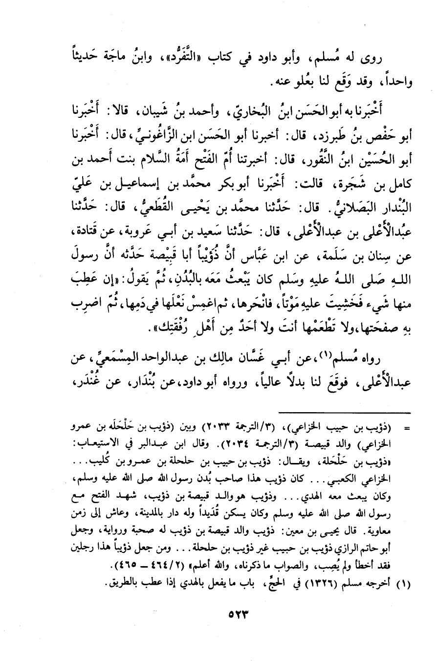 أَخْبَرَنَا بِهِ أَبُو الْحَسَنِ بْنُ الْبُخَارِيِّ، وأحمد بْن شيبان، قَالا: أخبرنا أَبُو حفص بن طَبَرْزَذَ، قال: أَخْبَرَنَا أَبُو الْحَسَنِ بْنُ الزَّاغُونِيُّ قال: أَخْبَرَنَا أَبُو الْحُسَيْنِ ابن النَّقُّورِ، قال: أَخْبَرَتْنَا أُمُّ الْفَتْحِ أَمَةُ السَّلامِ بِنْتُ أَحْمَدِ بْنِ كَامِلِ بْنِ شَجَرَةَ، قَالَتْ: أَخْبَرَنَا أَبُو بَكْر مُحَمَّد بْن إِسْمَاعِيل بْنِ عَلِيٍّ الْبُنْدَارُ الْبَصَلانِيُّ، قال: حَدَّثَنَا مُحَمَّدُ بْنُ يَحْيَى الْقَطِعِيُّ، قال: حَدَّثَنَا عبد الاعلى بن عبد الاعلى، قال: حَدَّثَنَا سَعِيد بْنُ أَبي عَرُوبَة، عَنْ قَتَادَةَ، عَنْ سِنَانِ بْنِ سَلَمَةَ، عَنِ ابْنِ عَبَّاسٍ أَنَّ ذُؤَيْبًا أَبَا قُبَيْصَةَ حَدَّثَهُ أن رَسُول اللَّهِ صَلَّى اللَّهُ عَلَيْهِ وسَلَّمَ كَانَ يَبْعَثُ مَعَهُ بِالْبُدْنِ، ثُمَّ يَقُولُ: إِنْ عَطِبَ مِنْهَا شَيْءٌ فَخَشِيتَ عَلَيْهِ مَوْتًا, فَانْحَرْهَا، ثُمَّ اغْمِسْ نَعْلَهَا فِي دَمِهَا, ثُمَّ اضْرِبْ بِهِ صَفْحَتَهَا، ولا تَطْعَمْهَا أَنْتَ ولا أَحَدٌ مِنْ أَهْلِ رُفْقَتِكَ.