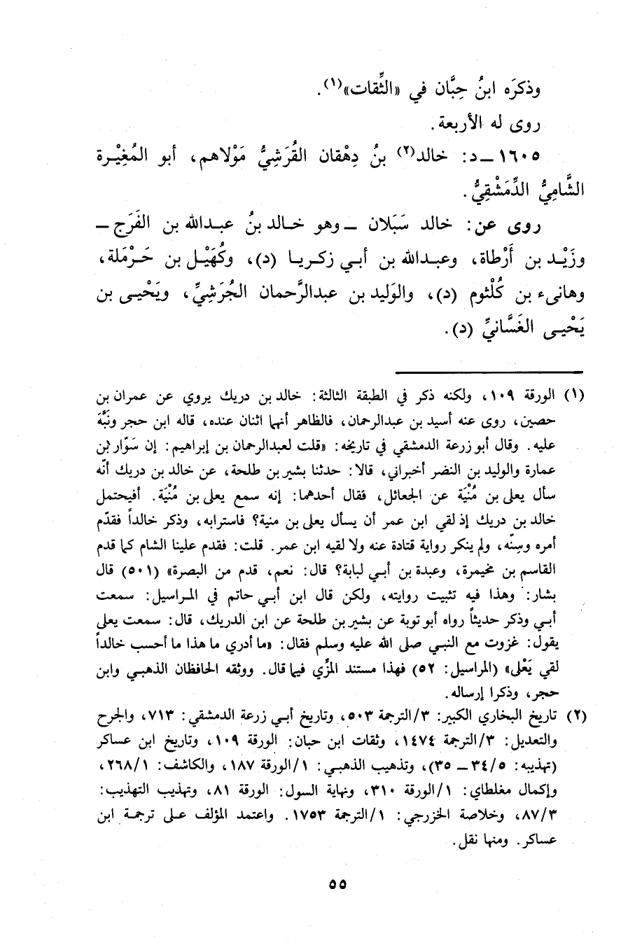 (1) الورقة 109، ولكنه ذكر في الطبقة الثالثة: خالد بن دريك يروي عن عِمْران بْن حصين، روى عنه أسيد بن عبد الرحمن، فالظاهر أنهما اثنان عنده، قاله ابن حجر ونبه عليه، وَقَال أبو زُرْعَة الدمشقي في تاريخه: قلت لعبد الرحمن بْن إِبْرَاهِيم: إن سوار بن عمارة والوليد بن النضر أخبراني، قالا: حَدَّثَنَا بشر بن طلحة. عن خالد بن دريك أنه سأل يَعْلَى بن منية عن الجعائل، فقال أحدهما: إنه سمع يَعْلَى بن منية، أفيحتمل خالد بن دريك إذ لقي ابن عُمَر أن يسأل يَعْلَى بن منية؟ فاسترابه، وذكر خالدا فقدم أمره وسنه، ولم ينكر رواية قتادة عنه ولا لقيه ابن عُمَر. قلت: فقدم علينا الشام كما قدم القاسم بن مخيمرة، وعبدة بن أَبي لبابة؟ قال: نعم، قدم من البصرة" (501) قال بشار: وهذا فيه تثبيت روايته، ولكن قال ابن أَبي حاتم في المراسيل: سمعت أبي وذكر حديثًا رواه أبو توبة عن بشير بن طلحة عن ابن الدريك، قال: سمعت يَعْلَى يقول: غزوت مع النبي صلى الله عليه وسلم فقال: ما أدري ما هذا ما أحسب خالدا لقي يَعْلَى" (المراسيل: 52) فهذا مستند المزي فيما قال: ووثقه الحافظان الذهبي وابن حجر، وذكر إرساله.