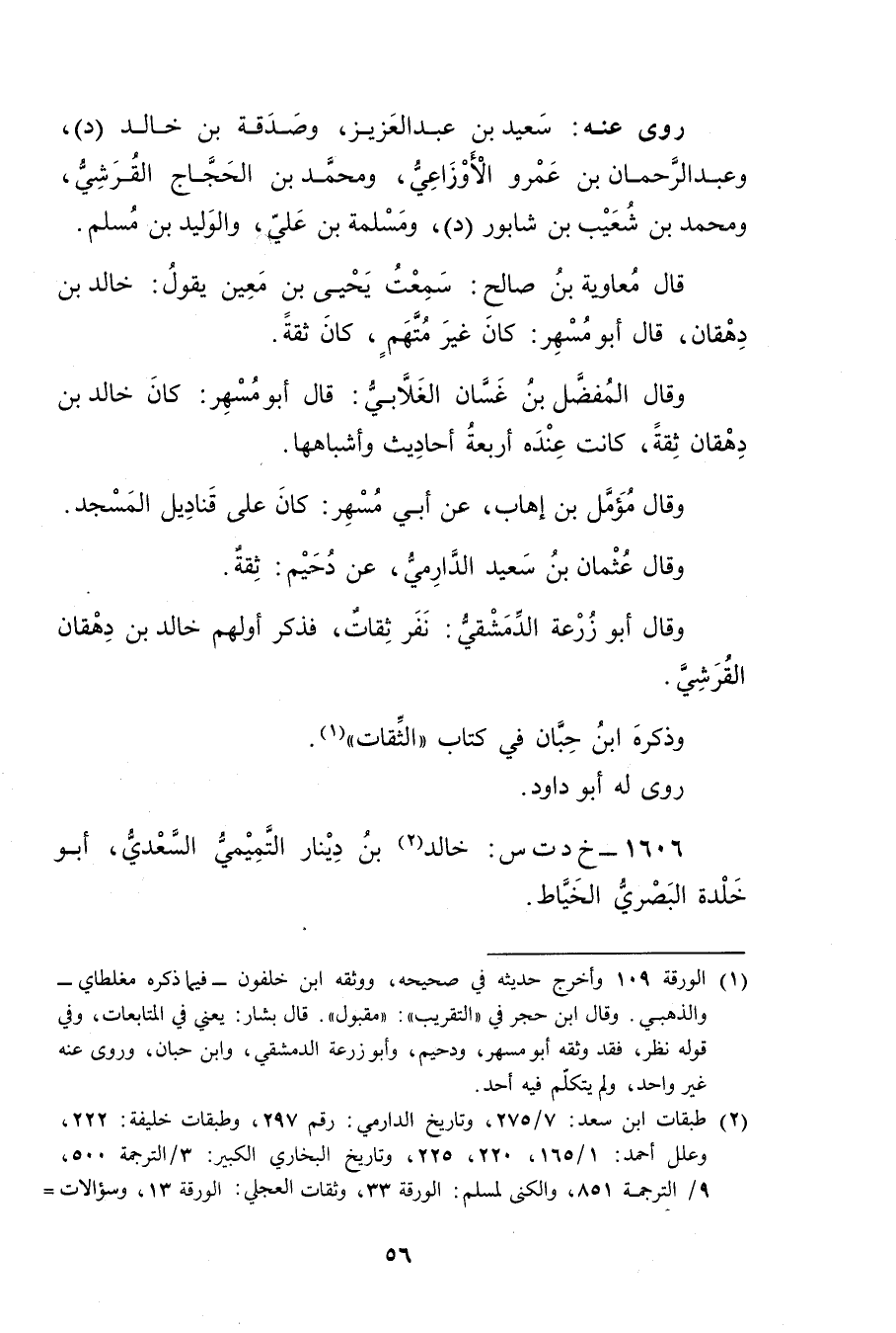 (1) الورقة 109 وأخرج حديثه في صحيحه، ووثقه ابن خلفون - فيما ذكره مغلطاي - والذهبي. وَقَال ابن حجر في "التقريب": مقبول"قال بشار: يعني في المتابعات، وفي قوله نظر، فقد وثقه أبو مسهر، ودحيم، وأبو زُرْعَة الدمشقي، وابن حبان، وروى عنه غير واحد، ولم يتكلم فيه أحد.