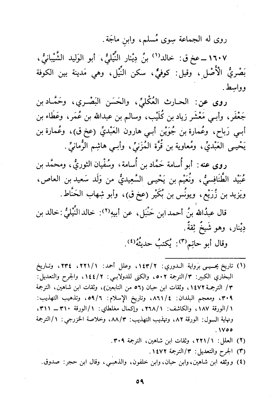 1607 - عخ ق: خالد بن دينار النيلي (1) ، أَبُو الْوَلِيدِ الشيباني، بصري الأصل، وقيل: كوفي، سكن النيل، وهي مدينة بين الكوفة وواسط.