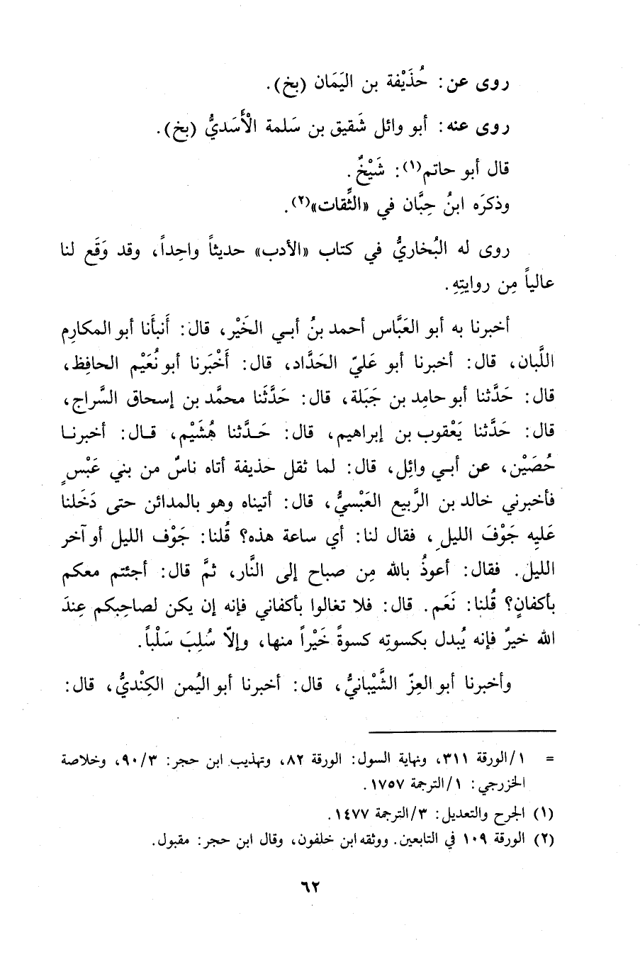 أخبرنا أَبُو الْعَبَّاس أَحْمَد بْن أَبي الخير، قال: أَنْبَأَنَا أَبُو المكارم اللبان، قال: أَخْبَرَنَا أَبُو عَلِيّ الحداد، قال: أَخْبَرَنَا أَبُو نُعَيْمٍ الْحَافِظُ. قال: حَدَّثَنَا أَبُو حامد بْن جبلة، قال: حَدَّثَنَا مُحَمَّد بْن إِسْحَاقَ السراج، قال: حَدَّثَنَا يعقوب بْن إِبْرَاهِيمَ، قال: حَدَّثَنَا هشيم، قال: أَخْبَرَنَا حصين، عَن أبي وائل، قال: لما ثقل حذيفة أتاه ناس من بني عبس فأَخْبَرَنِي خالد بْن الربيع العبسي، قال: أتيناه وهو بالمدائن حتى دخلنا عليه جوف الليل، فقَالَ لنا: أي ساعة هذه؟ قلنا: جوف الليل أو آخر الليل. فقَالَ: أعوذ بالله من صباح إِلَى النار، ثم قال: اجئتم معكم بأكفان؟ قلنا: نعم. قال: فلا تغالوا بأكفاني فإنه إن يكن لصاحبكم عند اللَّه خير فإنه يبدل بكسوته كسوة خيرا منها، وإلا سلب سلبا.
