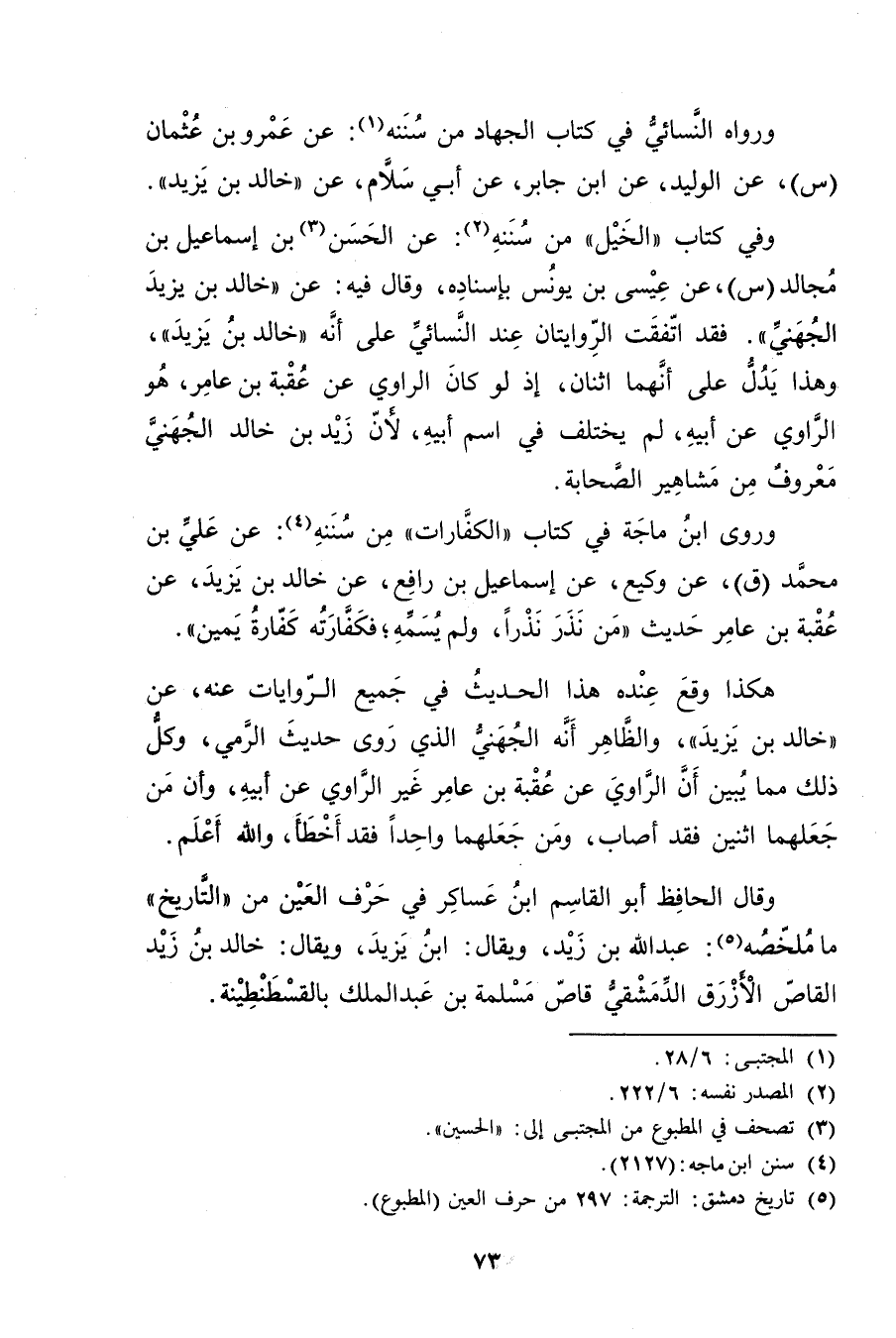 وفي كتاب"الخيل"من سننه (2) : عَنِ الْحَسَن (3) بْن إِسْمَاعِيلَ بْن مجالد (س) ، عَنْ عيسى بْن يونس بإسناده، وَقَال فيه: عَنْ"خالد بْن يزيد الجهني". فقد اتفقت الروايتان عن النَّسَائي عَلَى أَنَّهُ"خالد بْن يزيد"، وهذا يدل عَلَى أنهما اثنان، إذ لو كان الراوي عَنْ عقبة بْن عامر، هو الراوي عَن أَبِيهِ، لم يختلف فِي اسم أَبِيهِ، لأن زيد بْن خالد الجهني معروف من مشاهير الصحابة.