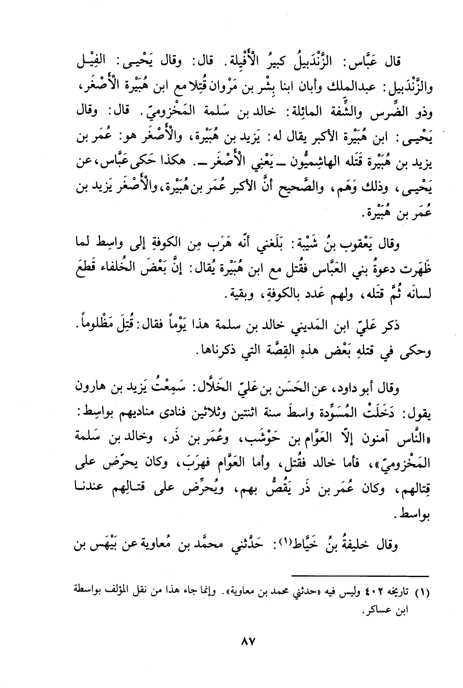 وَقَال أَبُو دَاوُدَ، عن الحسن بْن علي الخلال: سمعت يزيد بْن هارون يقول: دخلت المسودة واسط سنة اثنتين وثلاثين فنادى مناديهم بواسط: الناس آمنون إلا العوام بْن حوشب، وعُمَر بْن ذر، وخالد بْن سلمة المخزومي"فأما خالد فقتل، وأما العوام فهرب، وكان يحرض عَلَى قتالهم، وكان عُمَر بْن ذر يقص بهم، ويحرض عَلَى قتالهم عندنا بواسط.