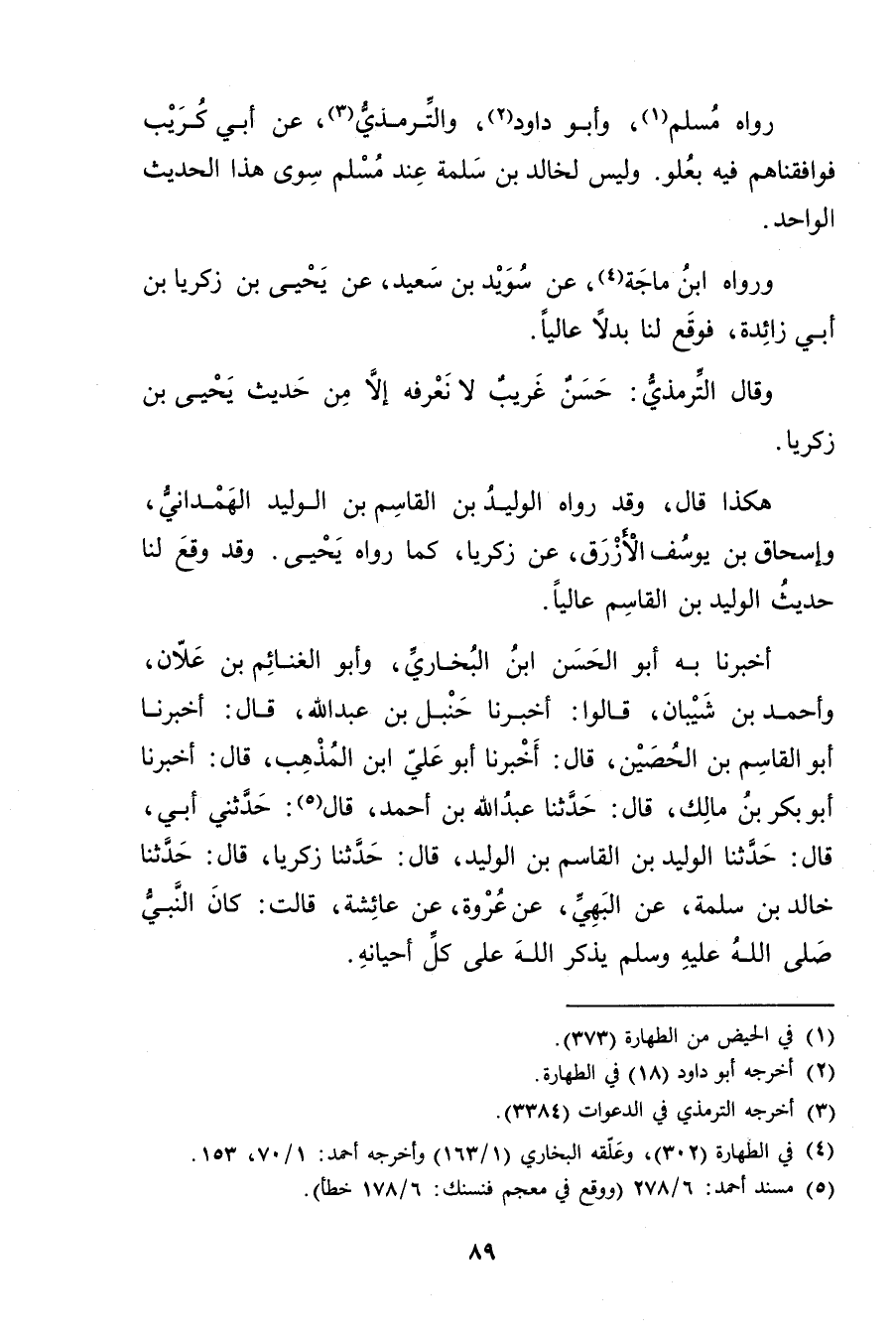 أَخْبَرَنَا بِهِ أَبُو الْحَسَنُ بْنُ الْبُخَارِيِّ، وأَبُو الْغَنَائِمِ بْن علان، وأحمد بْن شيبان، قالوا: أَخْبَرَنَا حنبل بْن عَبد اللَّهِ، قال: أخبرنا أَبُو الْقَاسِمِ بْن الحصين، قال: أَخْبَرَنَا أبو عَلِيِّ ابْنُ الْمُذْهِب، قال: أَخْبَرَنَا أبو بكر بْن مالك، قال: حَدَّثَنَا عَبد اللَّهِ بْنُ أَحْمَدَ، قال (5) : حَدَّثني أبي، قال: حَدَّثَنَا الْوَلِيد بْن الْقَاسِم بْن الْوَلِيدِ، قال: حَدَّثَنَا زَكَرِيَّا، قال: حَدَّثَنَا خَالِدِ بْنِ سَلَمَةَ، عَنِ الْبَهِيِّ، عَنْ عُرْوَةَ، عَنْ عَائِشَةَ، قَالَتْ: كَانَ النَّبِيّ صلى الله عليه وسَلَّمَ يَذْكُرُ اللَّهَ عَلَى كُلِّ أحيانه.