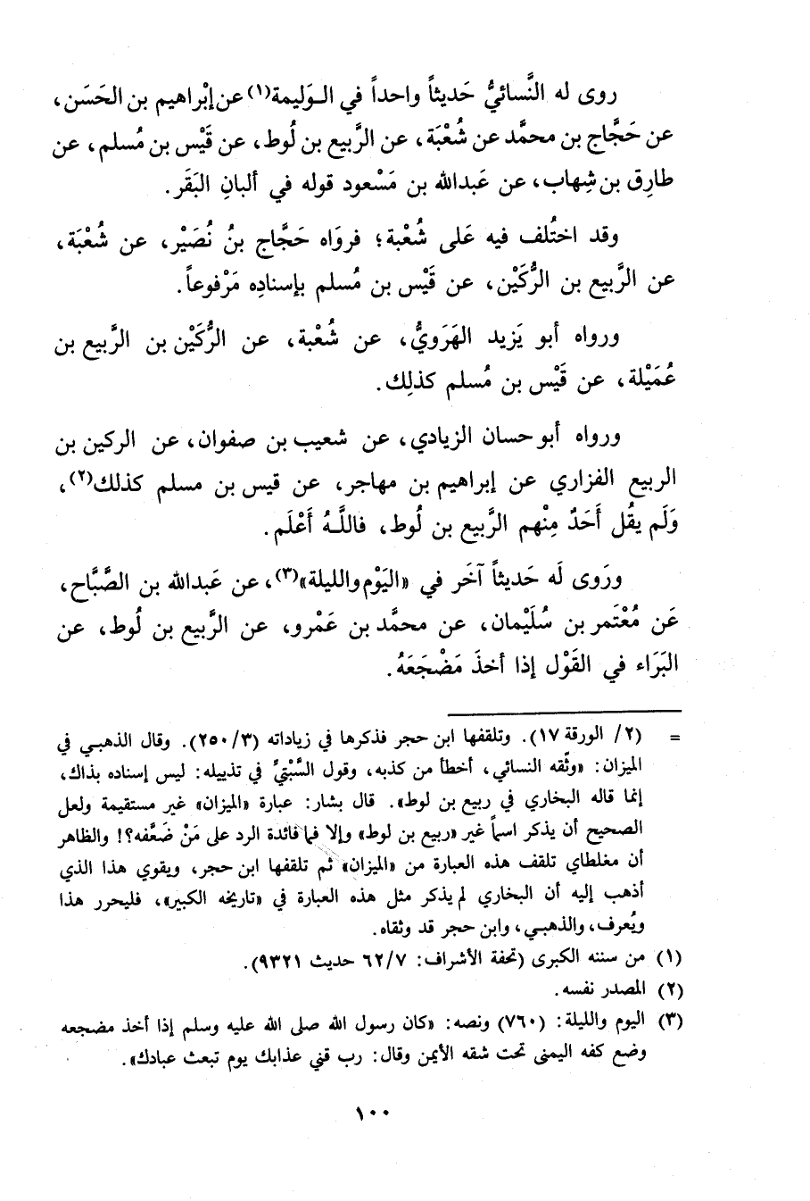 = (2 / الورقة 17) . وتلقفها ابن حجر فذكرها في زياداته (3 / 250) . وَقَال الذهبي في الميزان: وثقه النَّسَائي، أخطأ من كذبه، وقول السبتي في تذييله: ليس إسناده بذاك، إنما قاله البخاري في ربيع بن لوط". قال بشار: عبارة"الميزان"غير مستقيمة ولعل الصحيح أن يذكر اسما غير"ربيع بن لوط"وإلا فما فائدة الرد على من ضعفه؟ ! والظاهر أن مغلطاي تلقف هذه العبارة من"الميزان"ثم تلقفها ابن حجر، ويقوي هذا الذي أذهب إليه أن البخاري لم يذكر مثل هذه العبارة في "تاريخه الكبير"، فليحرر هذا ويعرف، والذهبي، وابن حجر قد وثقاه.
